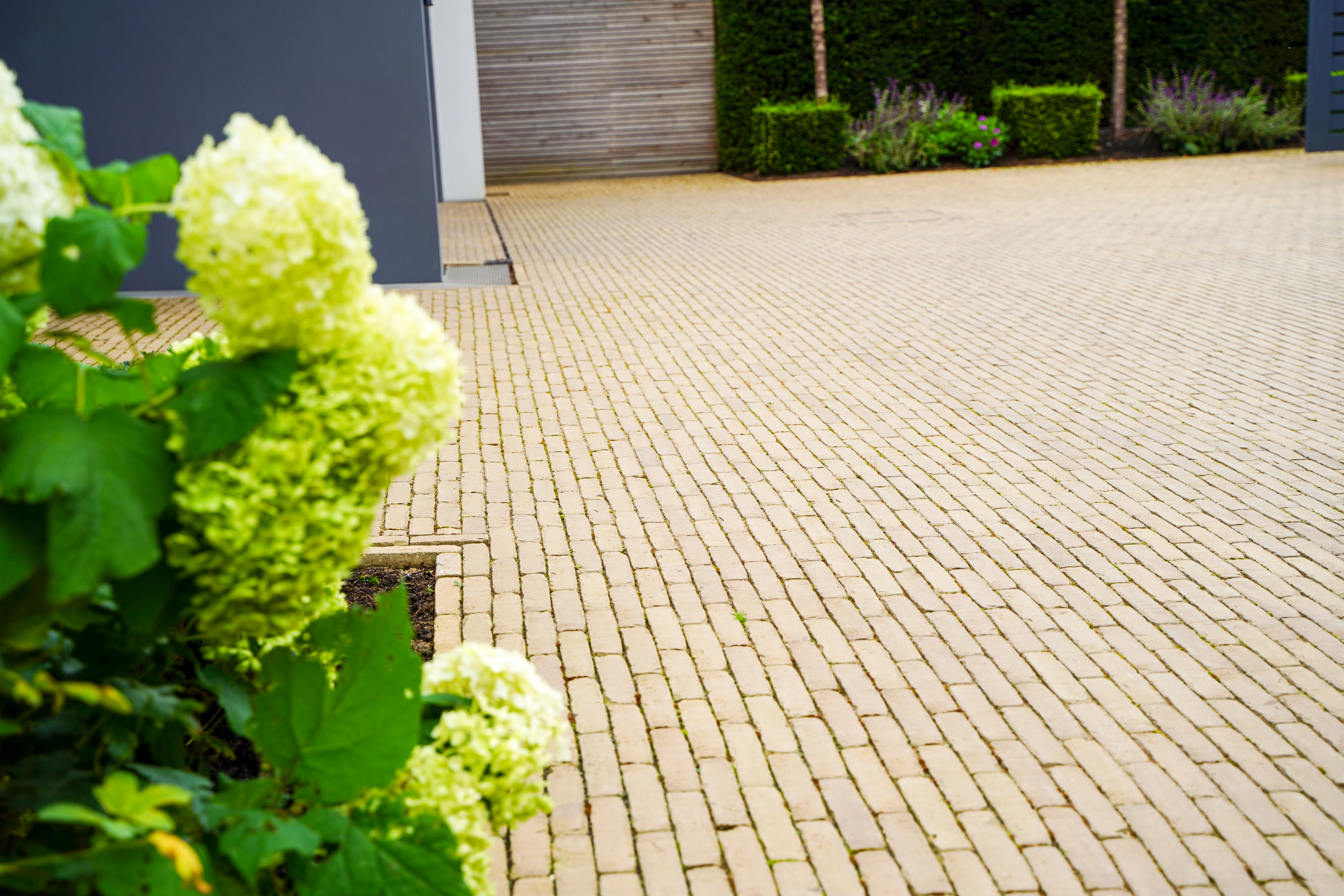 Ein Mindestgefälle von 1 bis 2 % wird empfohlen. Das Wasser sollte stets vom Gebäude wegfließen. Wenn das Wasser von einer (Schlitz-)Rinne aufgefangen wird, muss sie zur Aufrechterhaltung einer korrekten Entwässerung mindestens einmal jährlich gründlich gereinigt werden.
