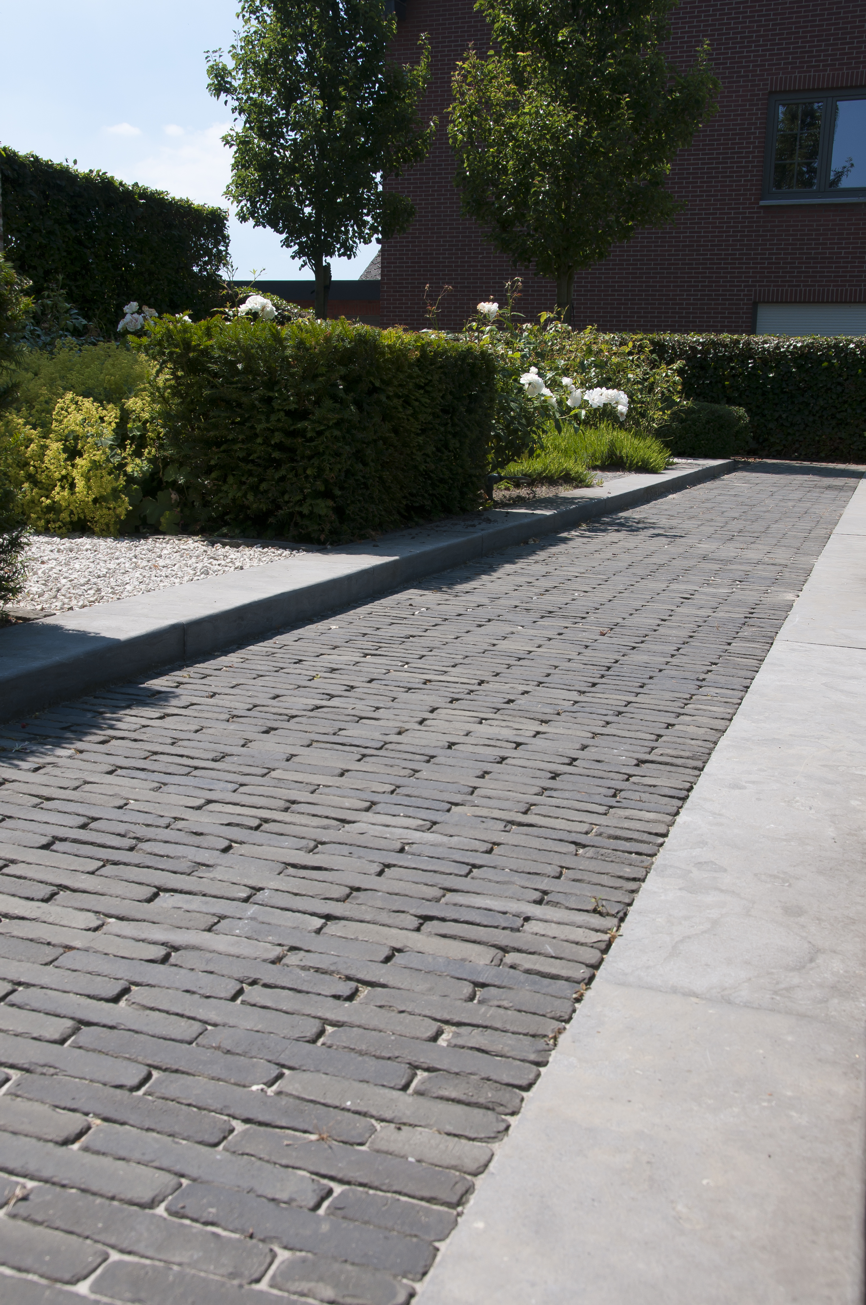 Ein Mindestgefälle von 1 bis 2 % wird empfohlen. Das Wasser sollte stets vom Gebäude wegfließen. Wenn das Wasser von einer (Schlitz-)Rinne aufgefangen wird, muss sie zur Aufrechterhaltung einer korrekten Entwässerung mindestens einmal jährlich gründlich gereinigt werden.