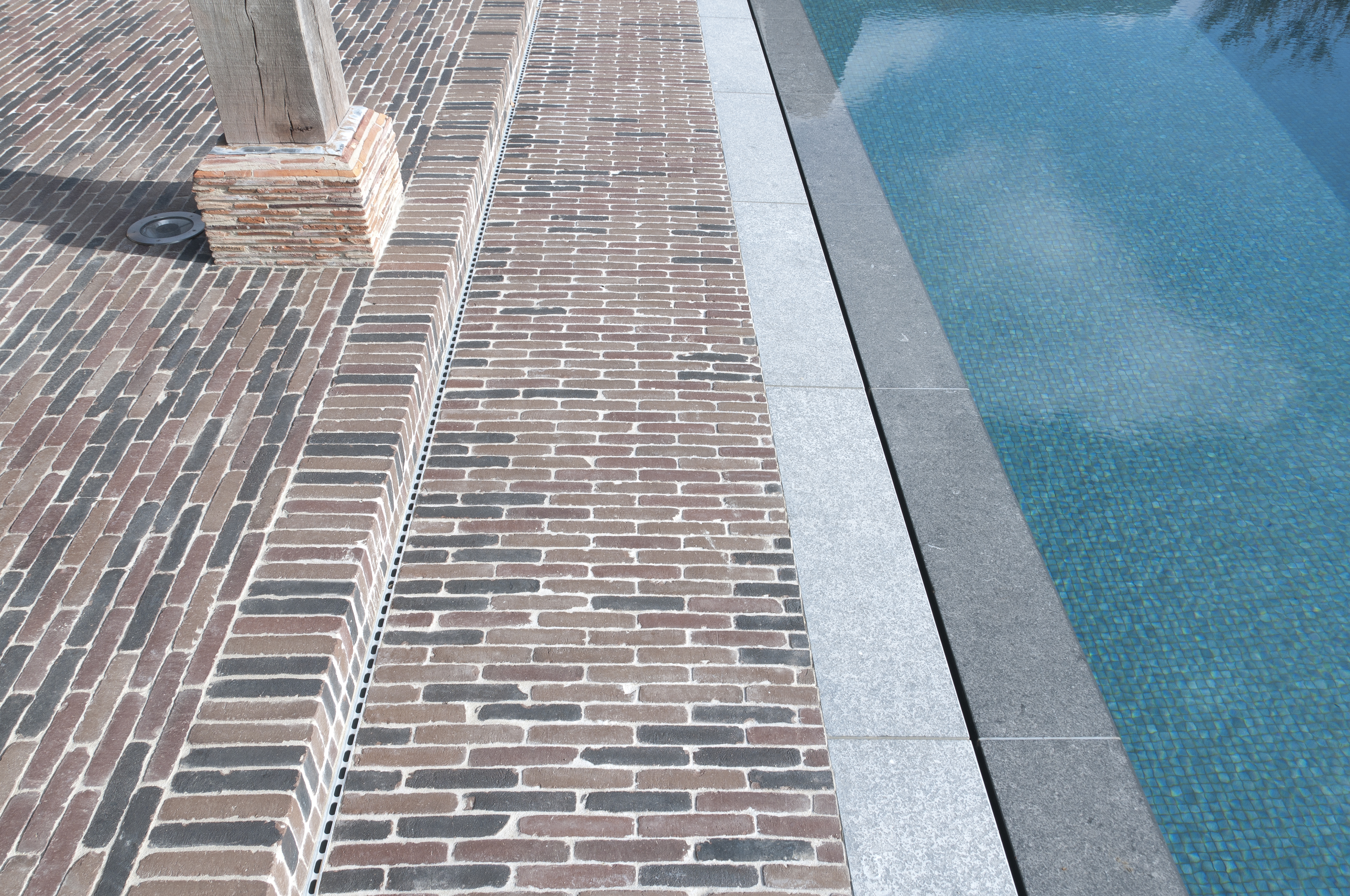 Ein Mindestgefälle von 1 bis 2 % wird empfohlen. Das Wasser sollte stets vom Gebäude wegfließen. Wenn das Wasser von einer (Schlitz-)Rinne aufgefangen wird, muss sie zur Aufrechterhaltung einer korrekten Entwässerung mindestens einmal jährlich gründlich gereinigt werden.
