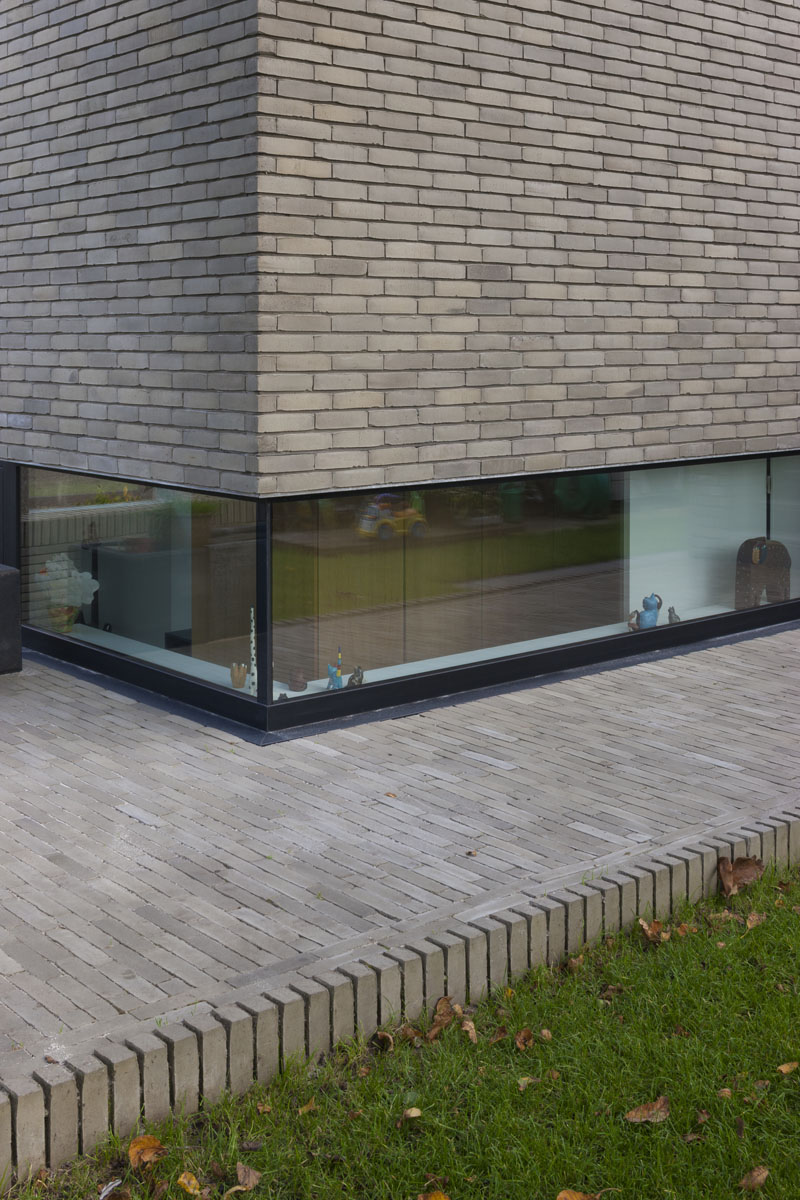 Diese moderne Neubauvilla bildet ein geometrisches Gesamtbild in grüner Umgebung. Eine Verkettung von niedrigen Volumen mit schlau erdachtem Durchblick sorgt zugleich für Offenheit und Intimität.