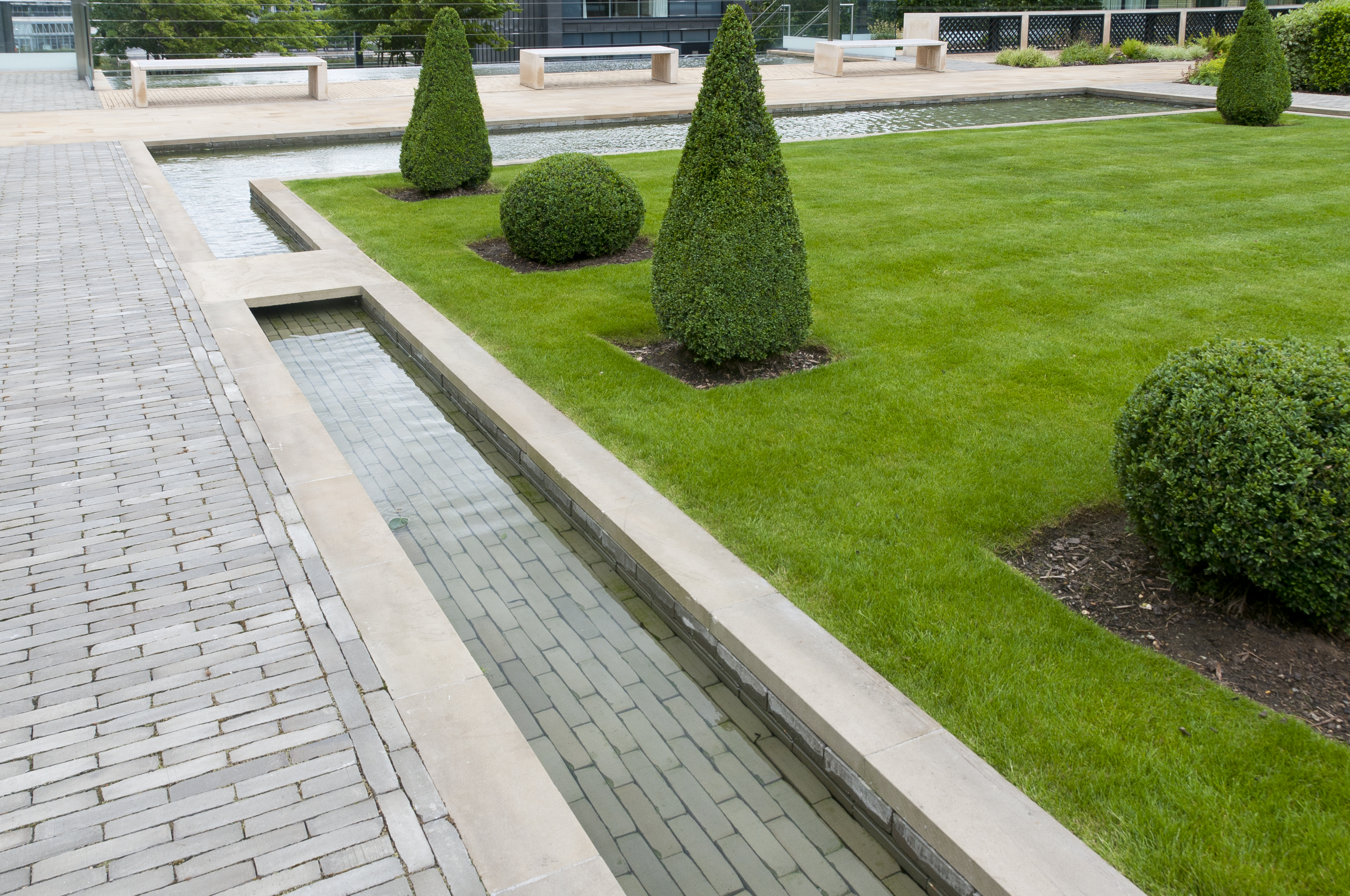 Ein Mindestgefälle von 1 bis 2 % wird empfohlen. Das Wasser sollte stets vom Gebäude wegfließen. Wenn das Wasser von einer (Schlitz-)Rinne aufgefangen wird, muss sie zur Aufrechterhaltung einer korrekten Entwässerung mindestens einmal jährlich gründlich gereinigt werden.
