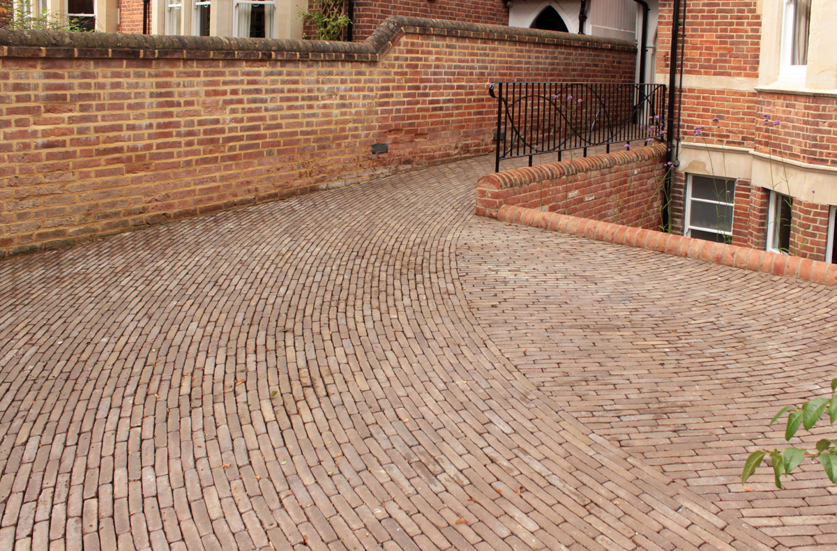 Die obere Ebene besteht aus Ancienne Belgique Camel Tonpflasterklinkern, die Stufen und untere Ebene aus Kalkstein, die Platten in getrommelter Form.