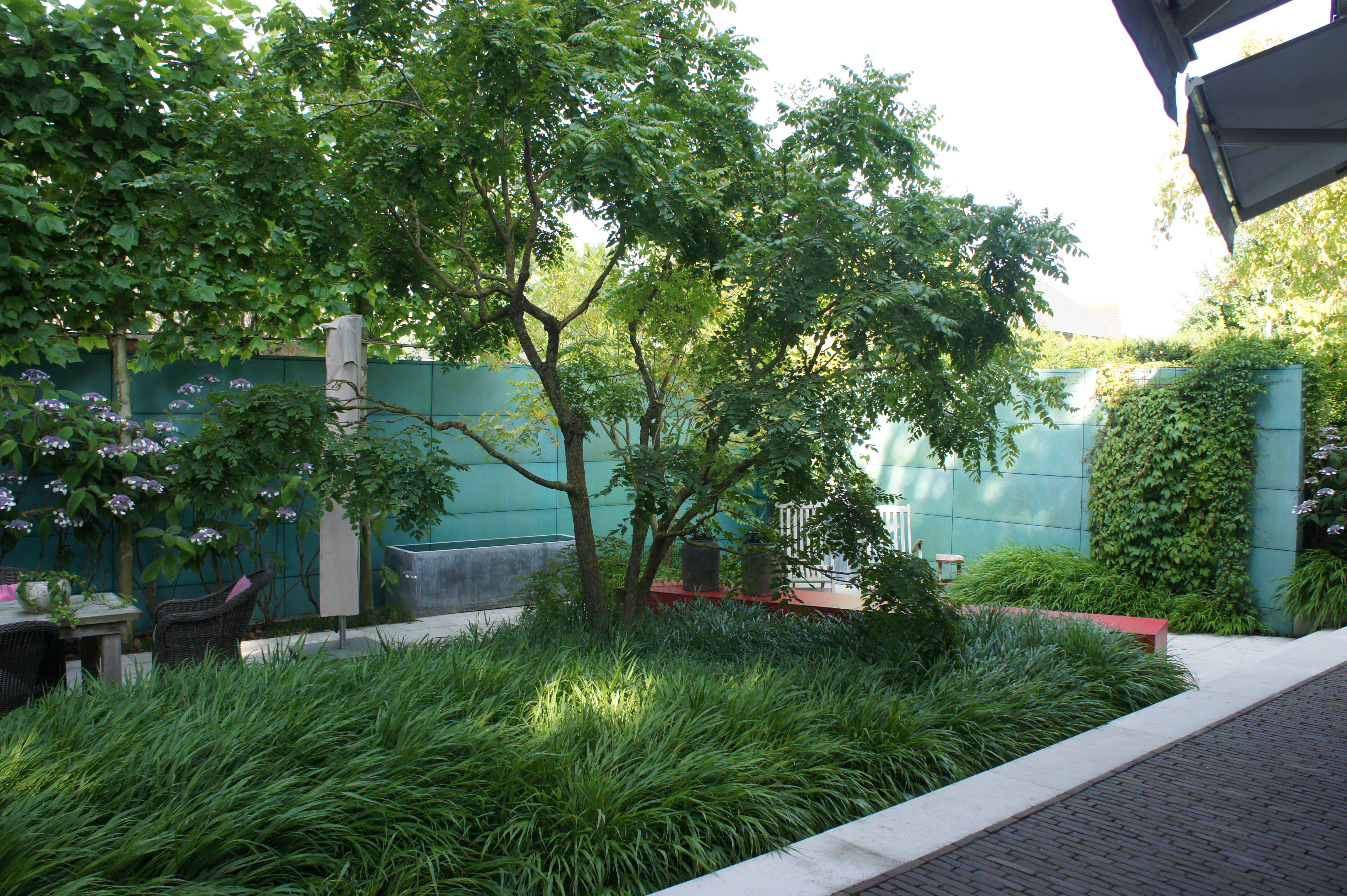 Der Gartenraum wird durch eine Treppenanlage in zwei Ebenen unterteilt, deren Verbindungsteil eine große grüne Gräserfläche mit roten Mohnpflanzen und einem Blasenbaum bildet.