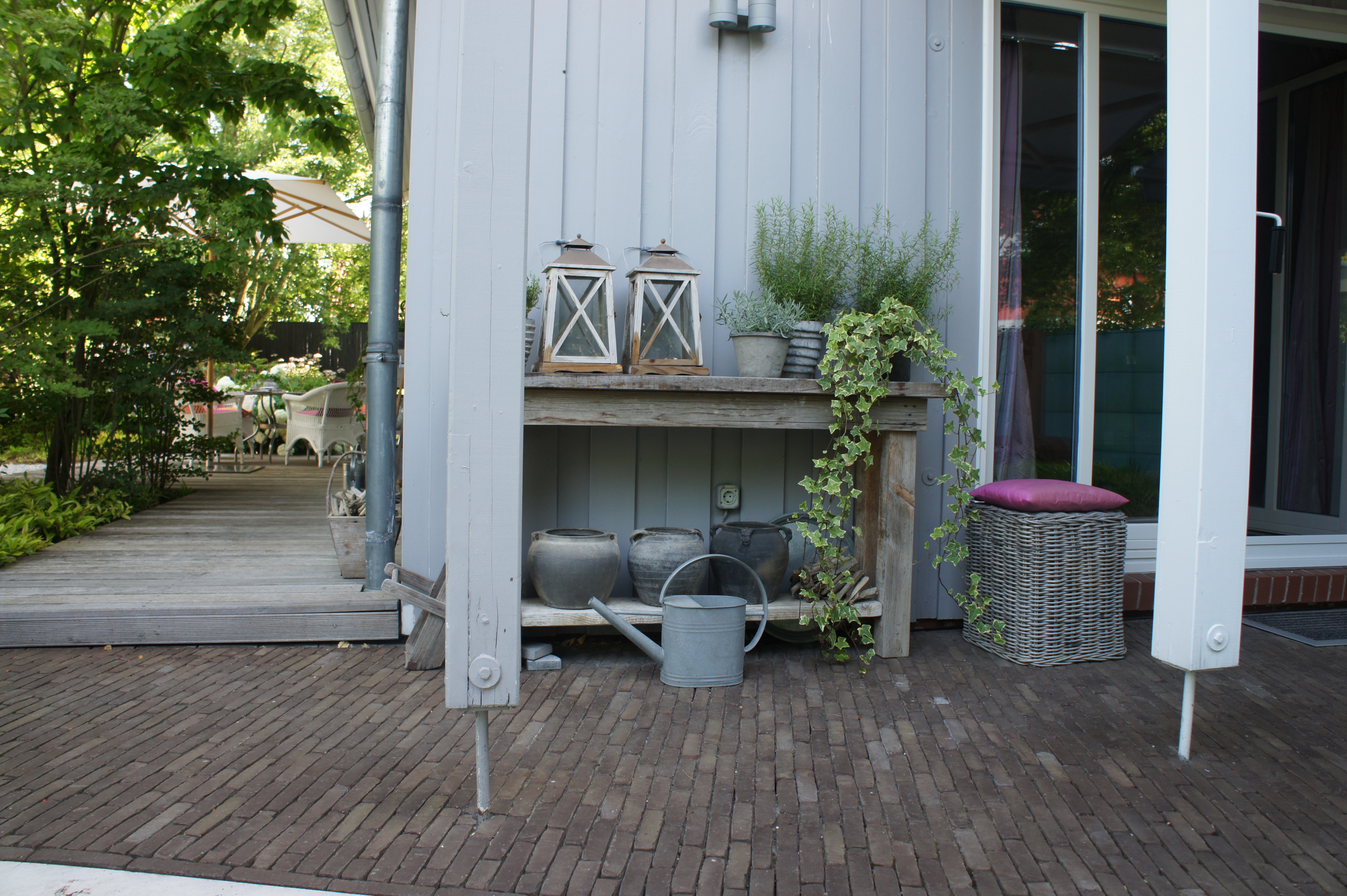 Die Tonpflasterklinker sind harmonisch an eine Holzterrasse angebunden, die zu einem weiteren Gartenraum führen.