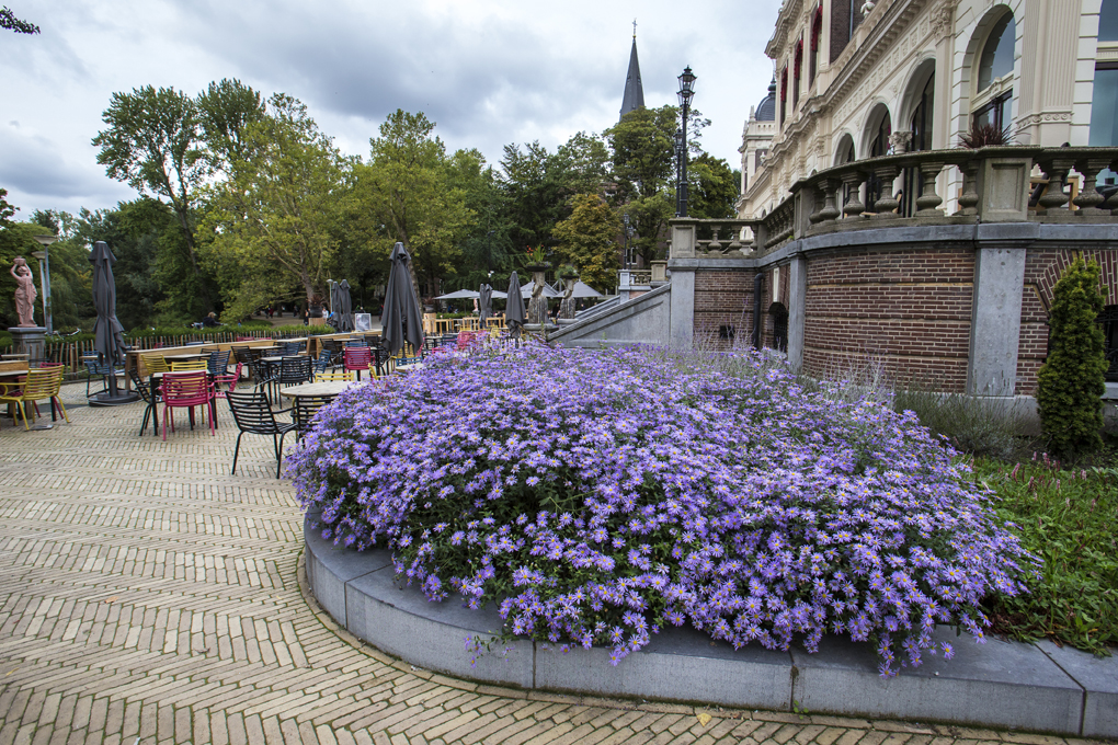 Durch die Änderung des Befestigungsmaterials fühlt der Besucher deutlich, dass er in einen anderen Bereich gelangt. Die Position der niedrigen Hecken rund um die Terrasse betont diesen Effekt. Diese Hecken folgen den schlängelnden Linien, die charakteristisch für Zochers Parkentwurf sind. Ihre niedrige und breite Bepflanzung räumt dem Gebäude einen prominenten Platz in der Landschaft des Vondelparks ein. Die Kombination dieser Elemente sorgt für eine klare Einteilung, welche die Nutzung der verschiedenen Bereiche in natürlicher Weise lenkt.