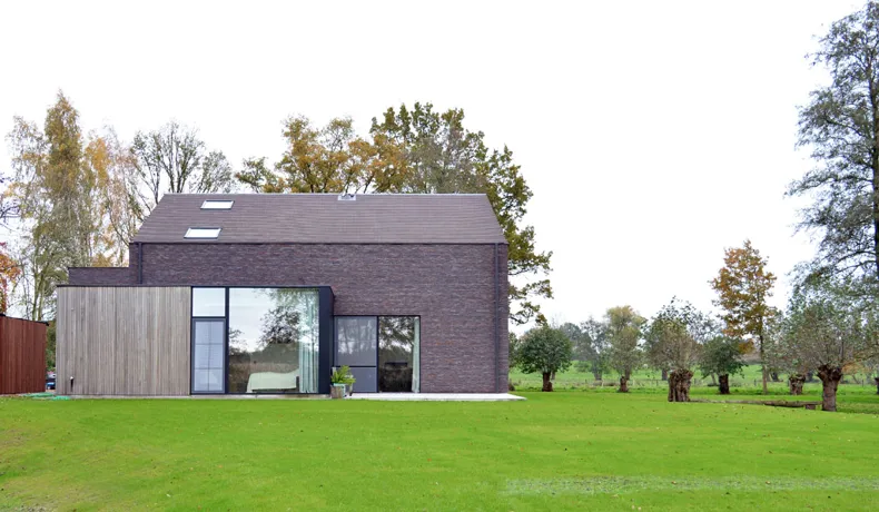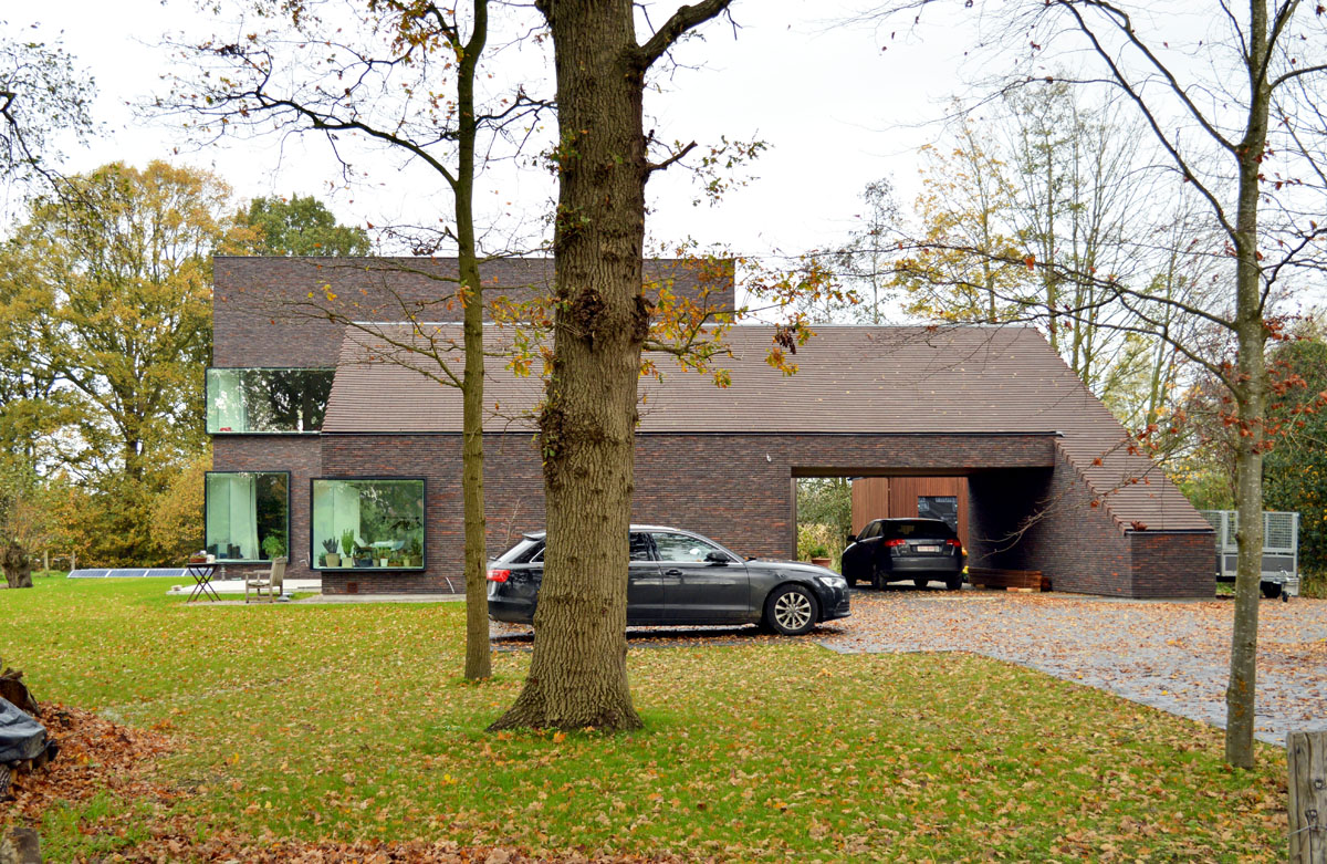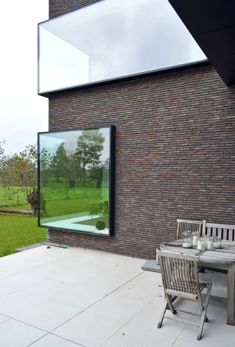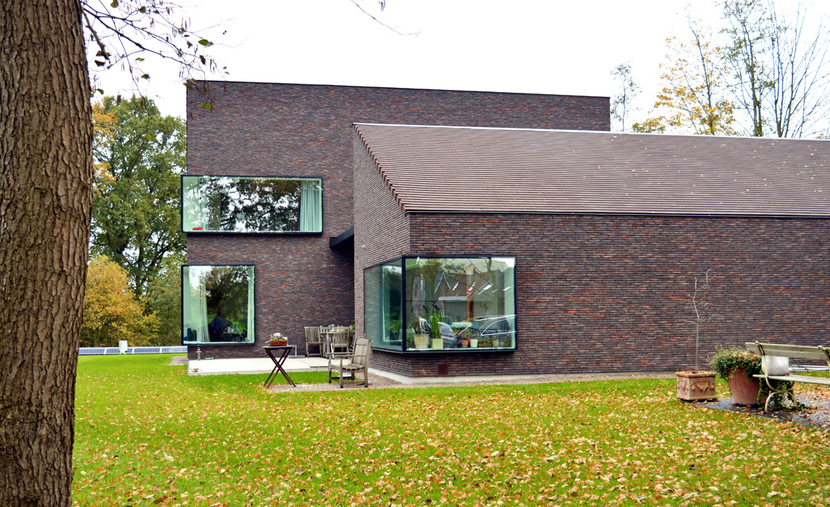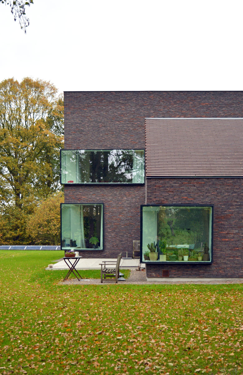 Die verwendeten Materialien: Klinker, Schiefer, Aluminium und Holz – wurden so ausgewählt, dass das Gebäude wie eine Einheit wirkt und eine warme, einladende Ausstrahlung hat. Die großen Fenster bieten an der Innenseite eine maximale Sicht auf die Landschaft und verleihen dem Haus an der Außenseite einen ganz eigenen Charakter.