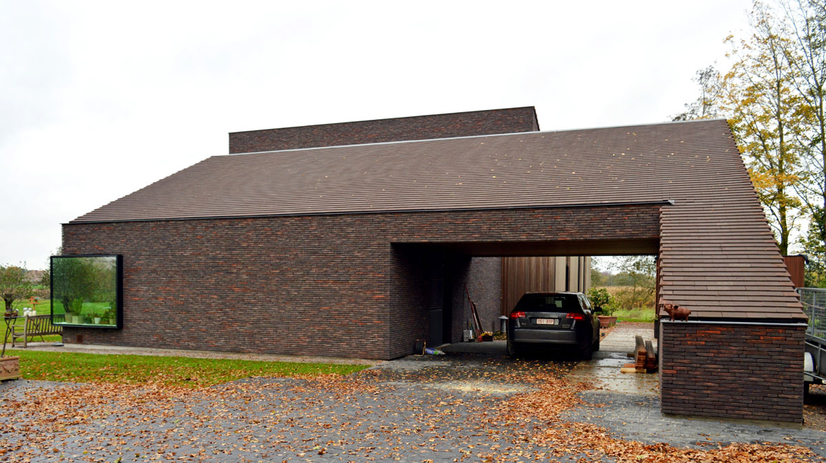 Die schwarz-rote Farbe des linea 3007 Verblender sind in Einklang mit den Farben der umliegenden Natur: Bäume, Herbstlaub, Erde. Die nuanciert gemaserten Verblender verweisen auf die Struktur der Baumstämme. Mit dem Schiefer in derselben Farbe wie die Dachdeckung verschmilzt die Grenze zwischen Wand und Dach.