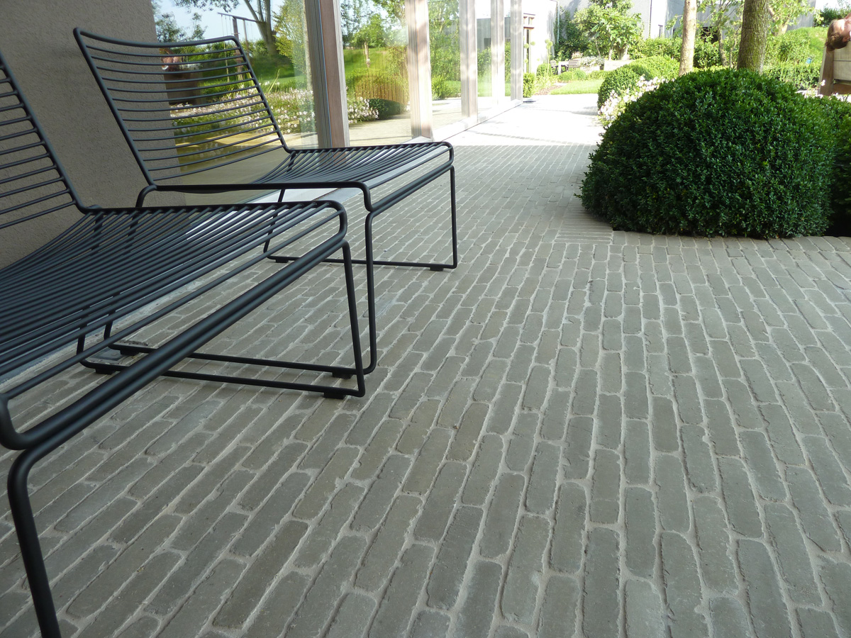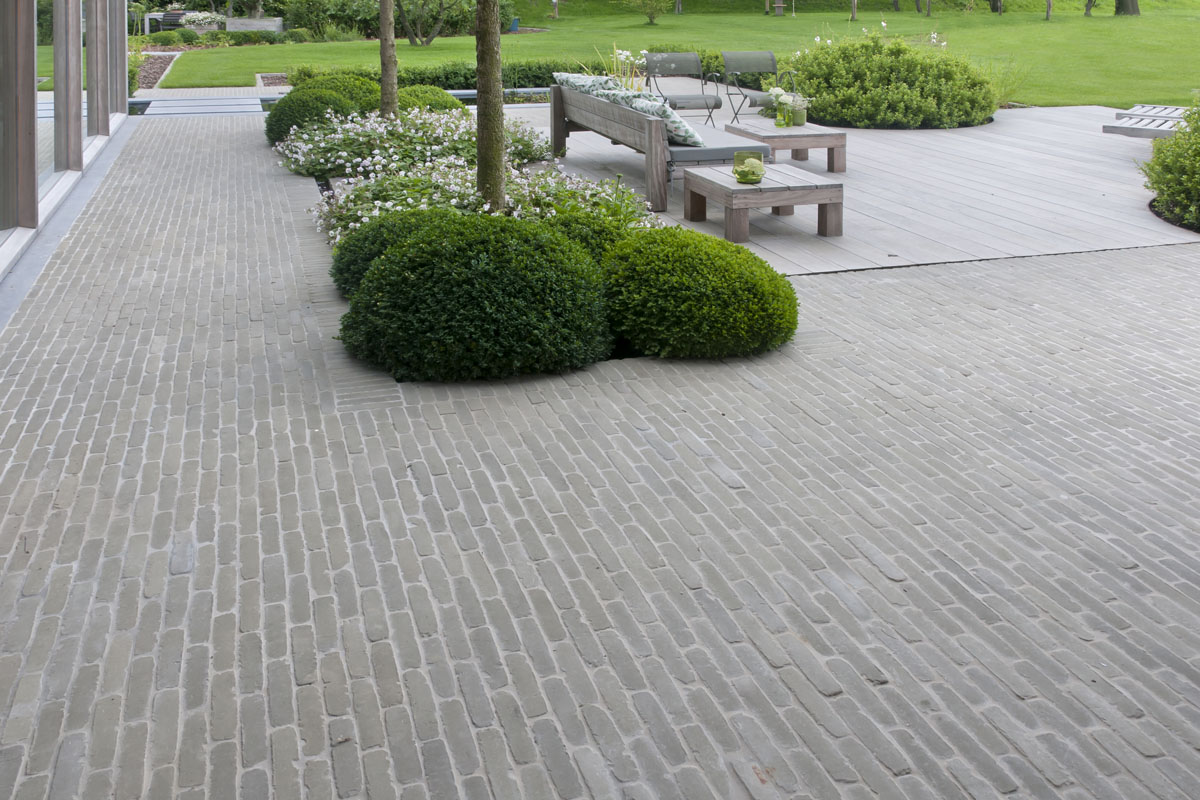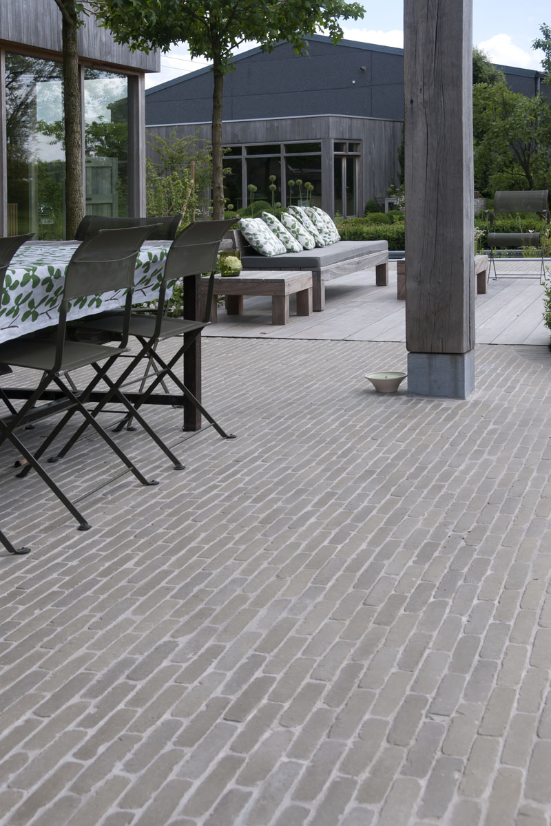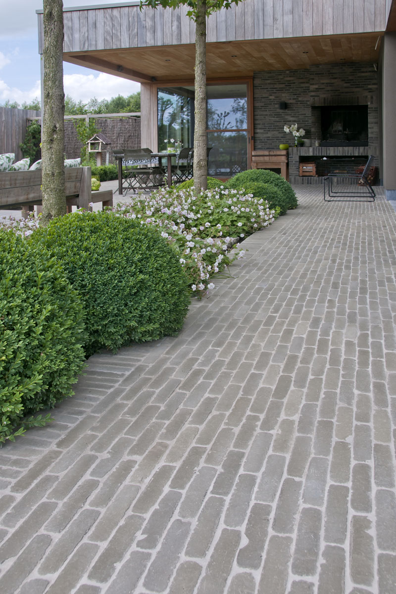 Die Ancienne Belgique Perlegrau Tonpflasterklinker zeigen, wie diese elegante Bodenverfestigung für unterschiedliche Stile verwendet werden kann. Der hellgraue Ton passt perfekt sowohl zu den dunkelgrauen Miniature Schwarz Grau Verblender als auch zum Belgischen Blaustein und dem Afrormosia-Hartholz.