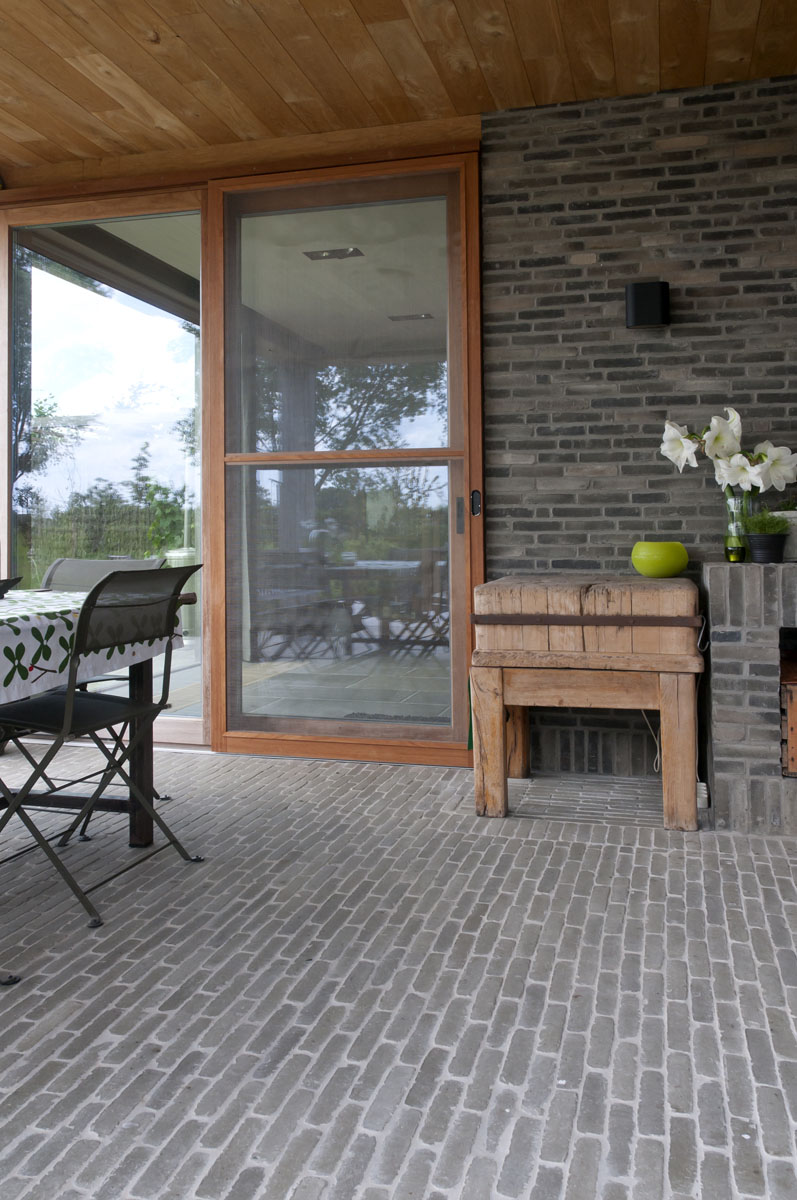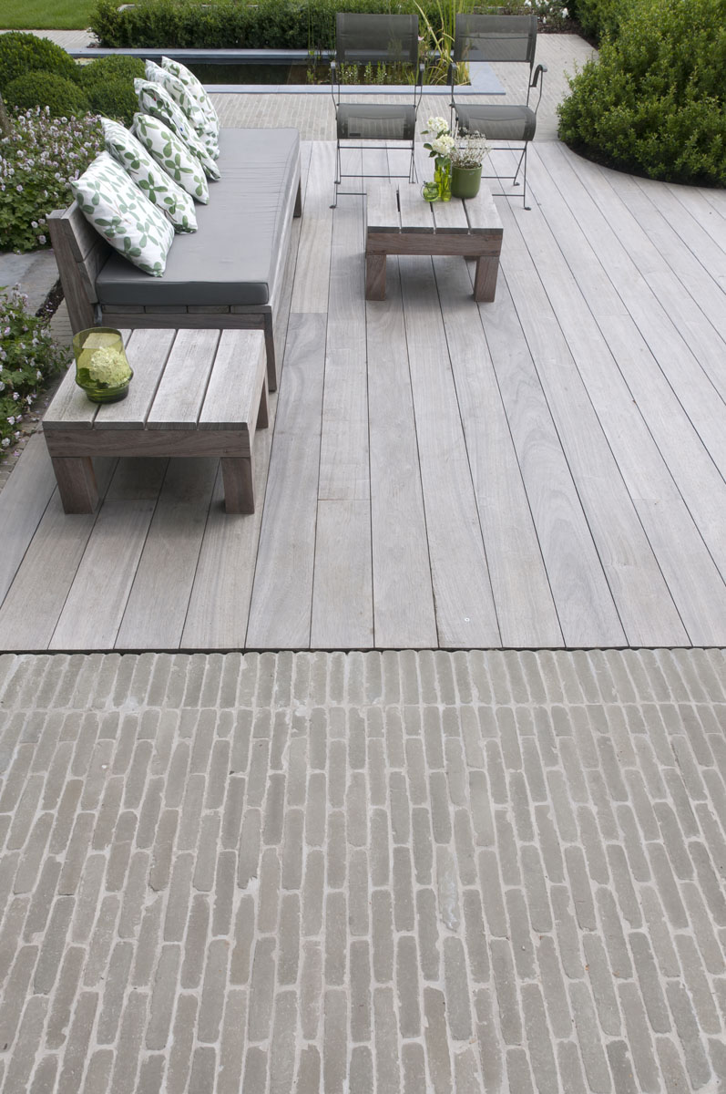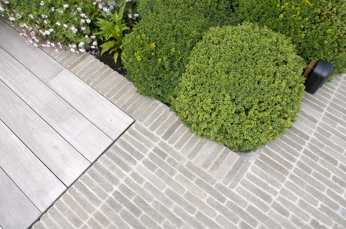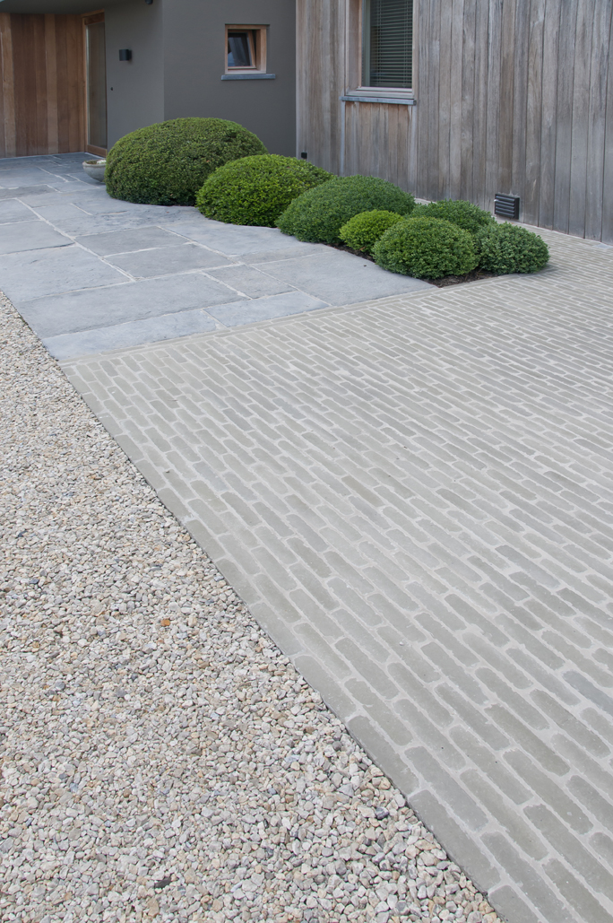 Die Ancienne Belgique Perlegrau Tonpflasterklinker zeigen, wie diese elegante Bodenverfestigung für unterschiedliche Stile verwendet werden kann. Der hellgraue Ton passt perfekt sowohl zu den dunkelgrauen Miniature Schwarz Grau Verblender als auch zum Belgischen Blaustein und dem Afrormosia-Hartholz.