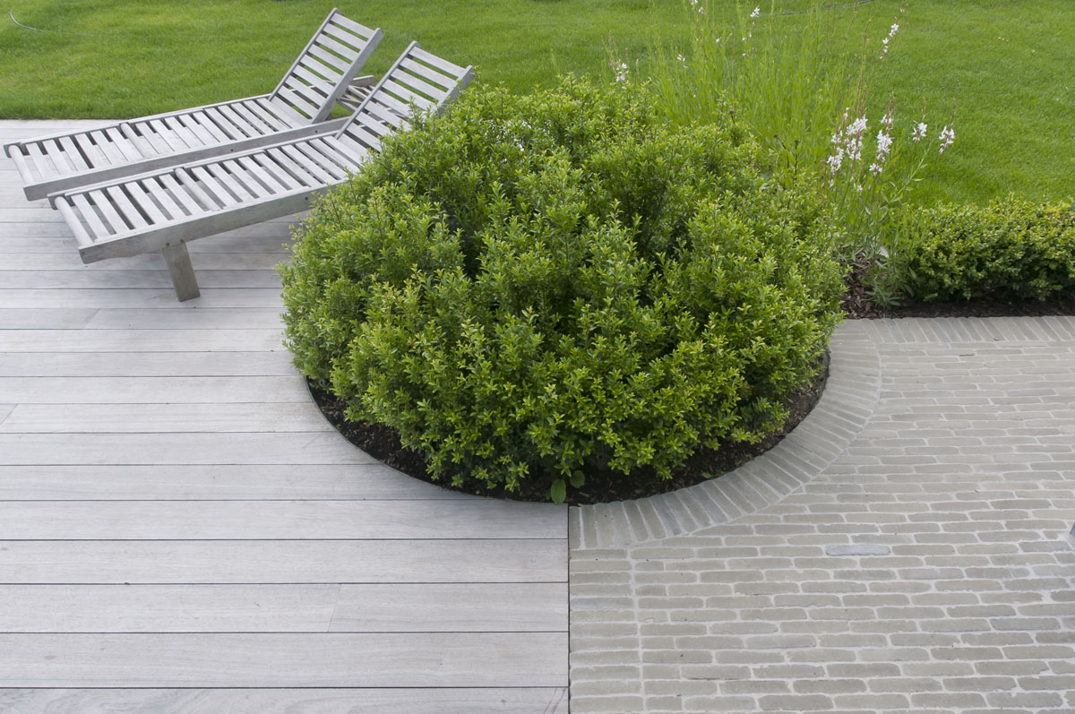 Mit einem Stil, der nicht ganz ländlich aber auch nicht ausgesprochen modern ist, haben wir uns natürlicher Materialien bedient und diese auf unterschiedliche Art verwendet und kombiniert (Holz - Tonsteinpflaster - alter Belgischer Blaustein - Kies und mehr).“