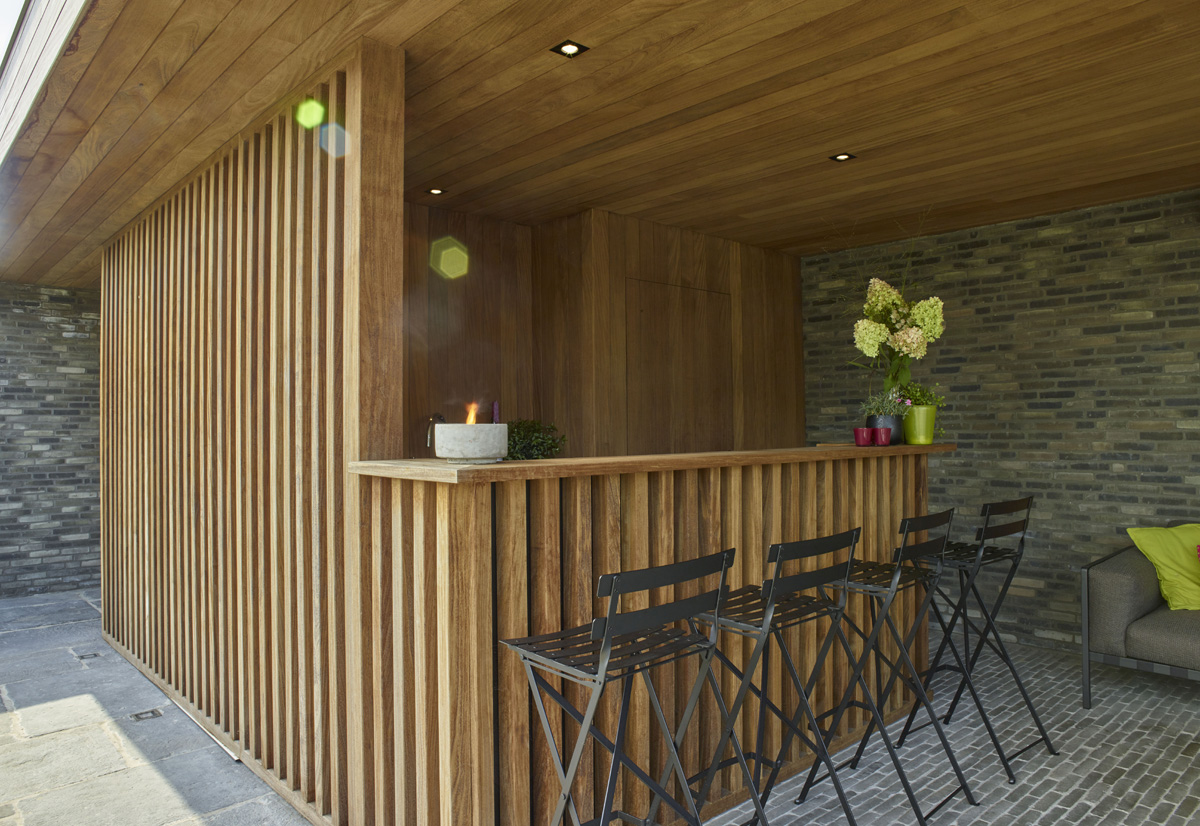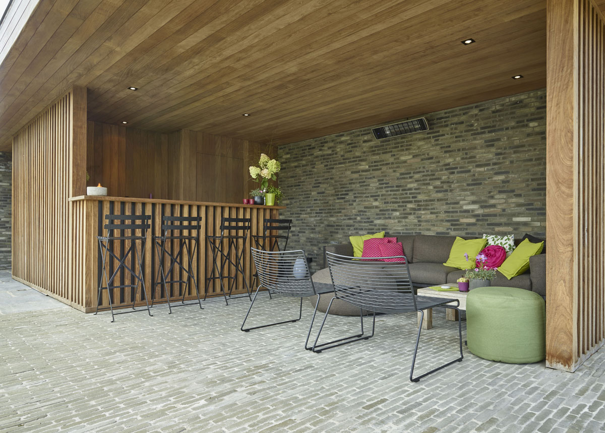 Das Poolhaus aus Afrormosia-Holz ist mit Miniature Verblendern in Schwarz Grau ummauert und bietet den Bewohnern optimalen Komfort.