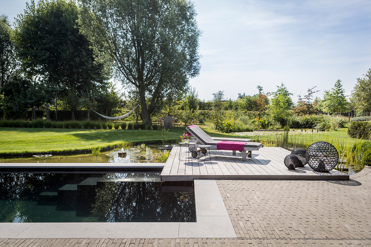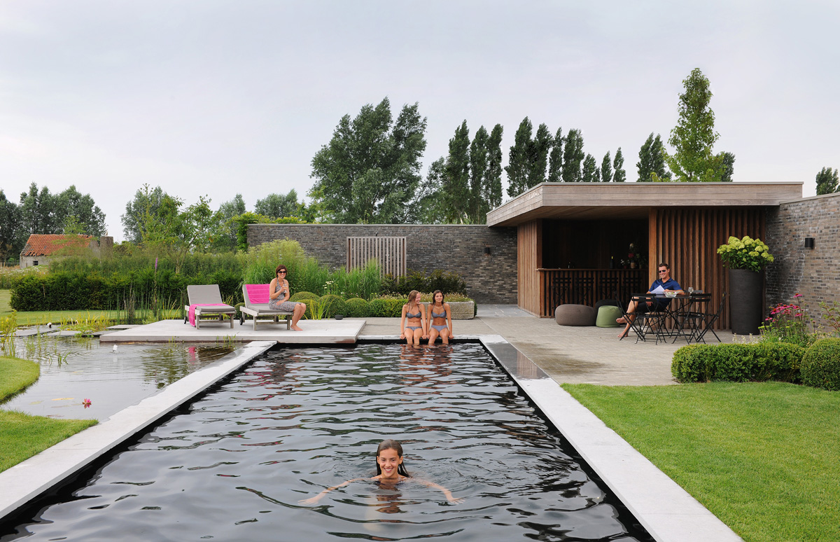 Dank des dunklen Bodens und dem Übergang zu einer natürlichen Wasseranlage hat das klar umrissene Schwimmbad die Optik eines Schwimmteichs.