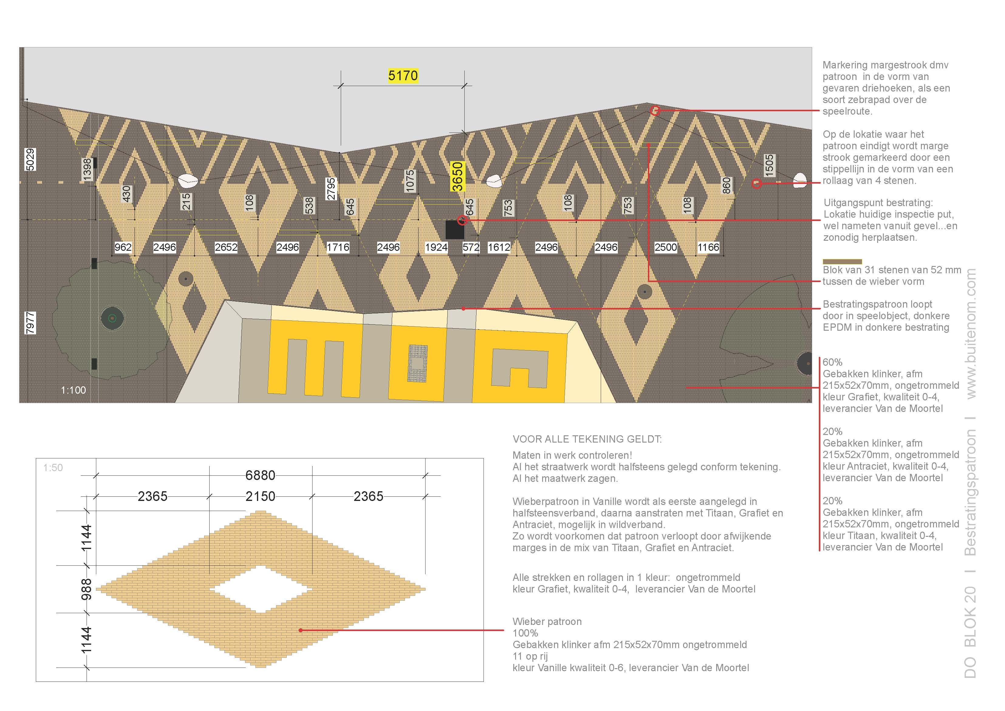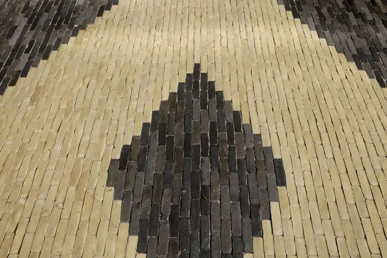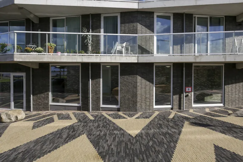 Bei ‚Vande Moortel‘ fand BUITENOM zum Erreichen dieses Effekts 3 prächtige gebrannte Tonpflasterklinker, nämlich einen unbesandeten Titan, einen funkelnden Graphit und einen besandeten Anthrazit. Zwischen diesen warmen dunkleren Tonpflasterklinkern befindet sich ein rautenförmiges Muster, das mit dem ‚Vanille‘-Tonpflasterklinker verarbeitet wurde. Die Inspiration für diese Rautenform kam von der eckigen umliegenden Architektur.