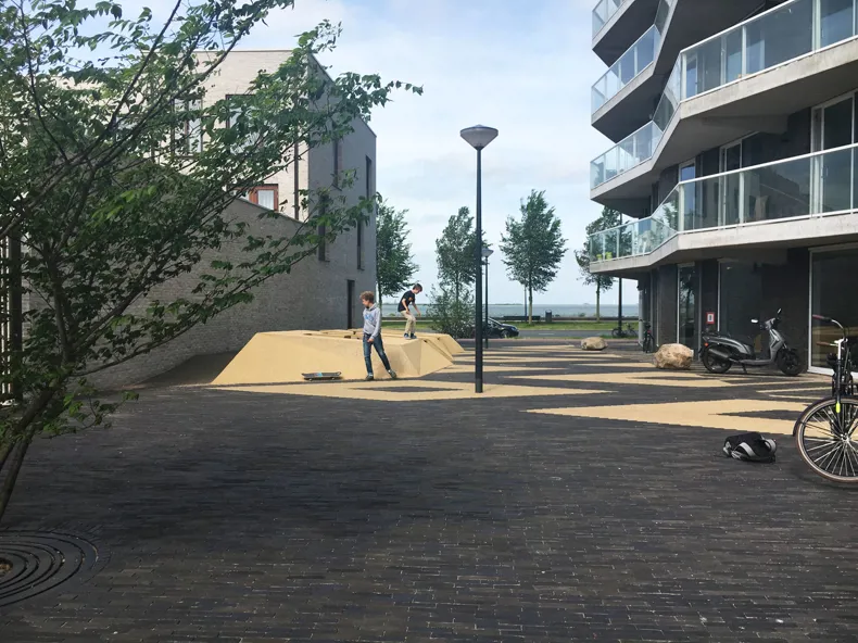 Zugleich fügt sich diese Rautenform in die geneigte Grundfläche des nächstgelegenen Spielobjekts ein und bildet so eine durchgehende Rad- und Rollerstrecke für die kleinen Kinder. Da wo die vollflächige ‚Vanille‘-Pflasterung in Linien übergeht, liegt die Grenze zwischen der öffentlichen Freifläche, die von der Gemeinde instandgehalten wird, und dem Randstreifen der Eigentümervereinigung, der selbst verwaltet werden muss. Durch diesen subtilen Übergang wurde einerseits verdeutlicht, welcher Teil von wem instand zu halten ist, und andererseits doch erreicht, dass es visuell nur 1 Gesamtfläche gibt. Der Teil zwischen dem Randstreifen und dem Spielobjekt ist für ein Feuerwehrfahrzeug zugänglich.