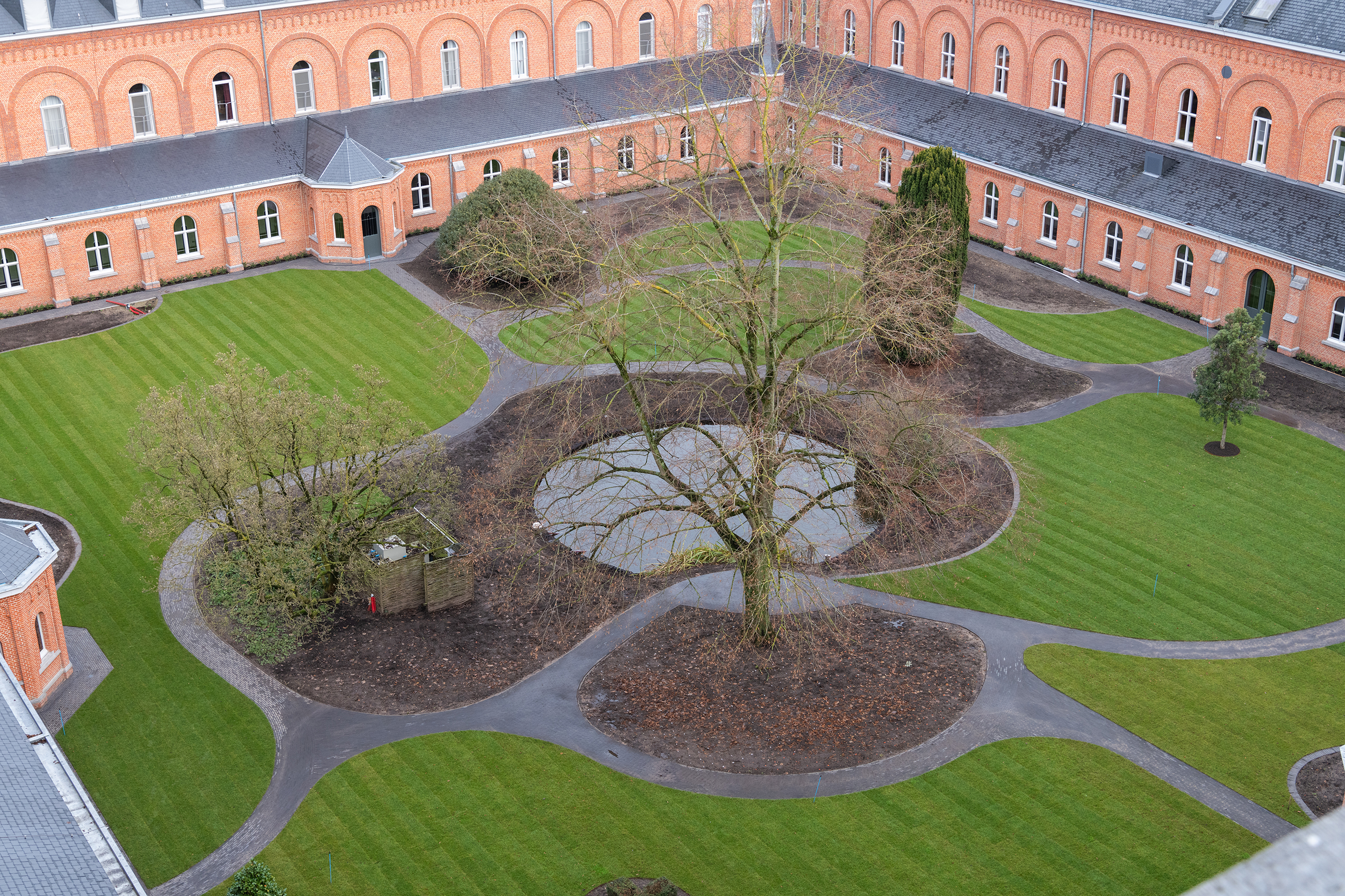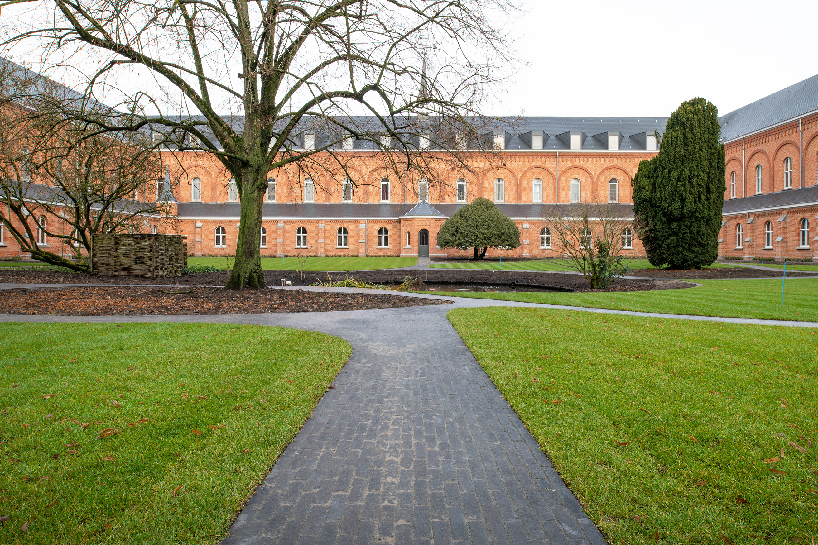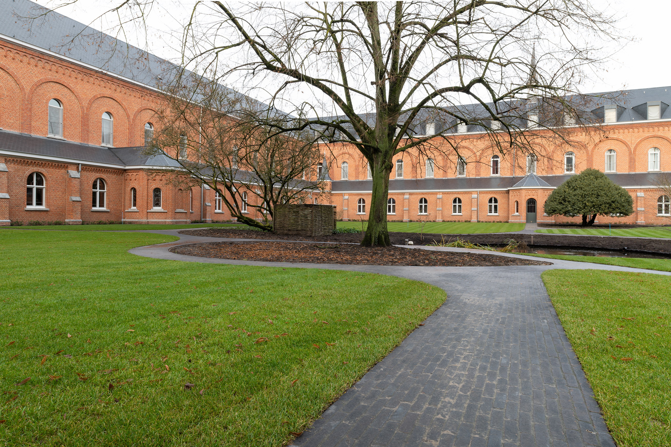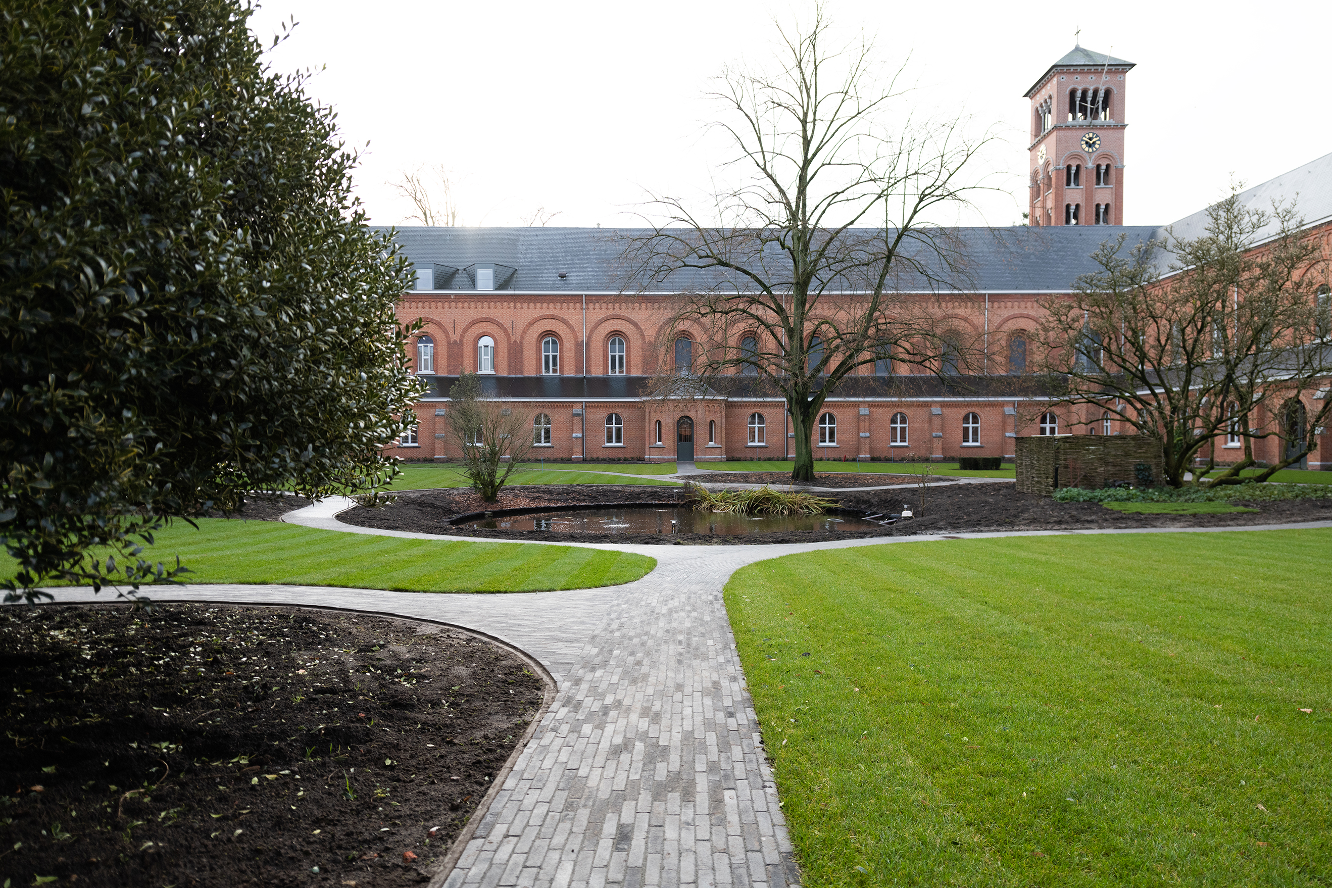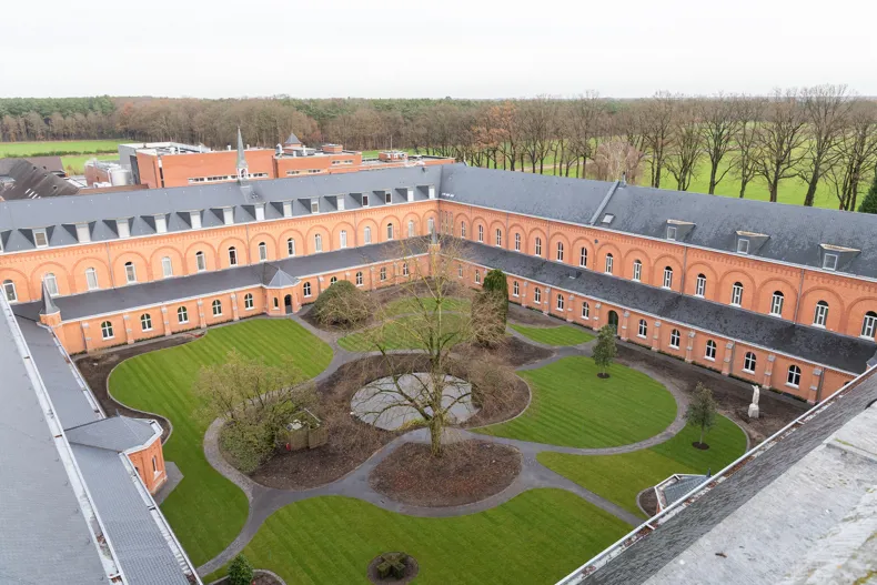 Fabian Verdult (Tuin- & Landschapsarchitectuur Willems – Verdult): „Wir haben uns auf Fotos vom Klosterhof im Jahr 1902 aus dem Archiv gestützt, in dem sanft ansteigende Formen klar erkennbar waren. Dies inspirierte uns, wieder mit fließenden Linien zu arbeiten, die eine perspektivische Wirkung entfalten und Neugier wecken, und auch zu Orten, an denen die Brüder auf einer Sitzgelegenheit zur Ruhe kommen können, jeweils in einer von ihnen gewählten Position. Das Konzept beinhaltet, eine Oase der reinen Ruhe und Verbindung mit der Spiritualität zu vereinen.