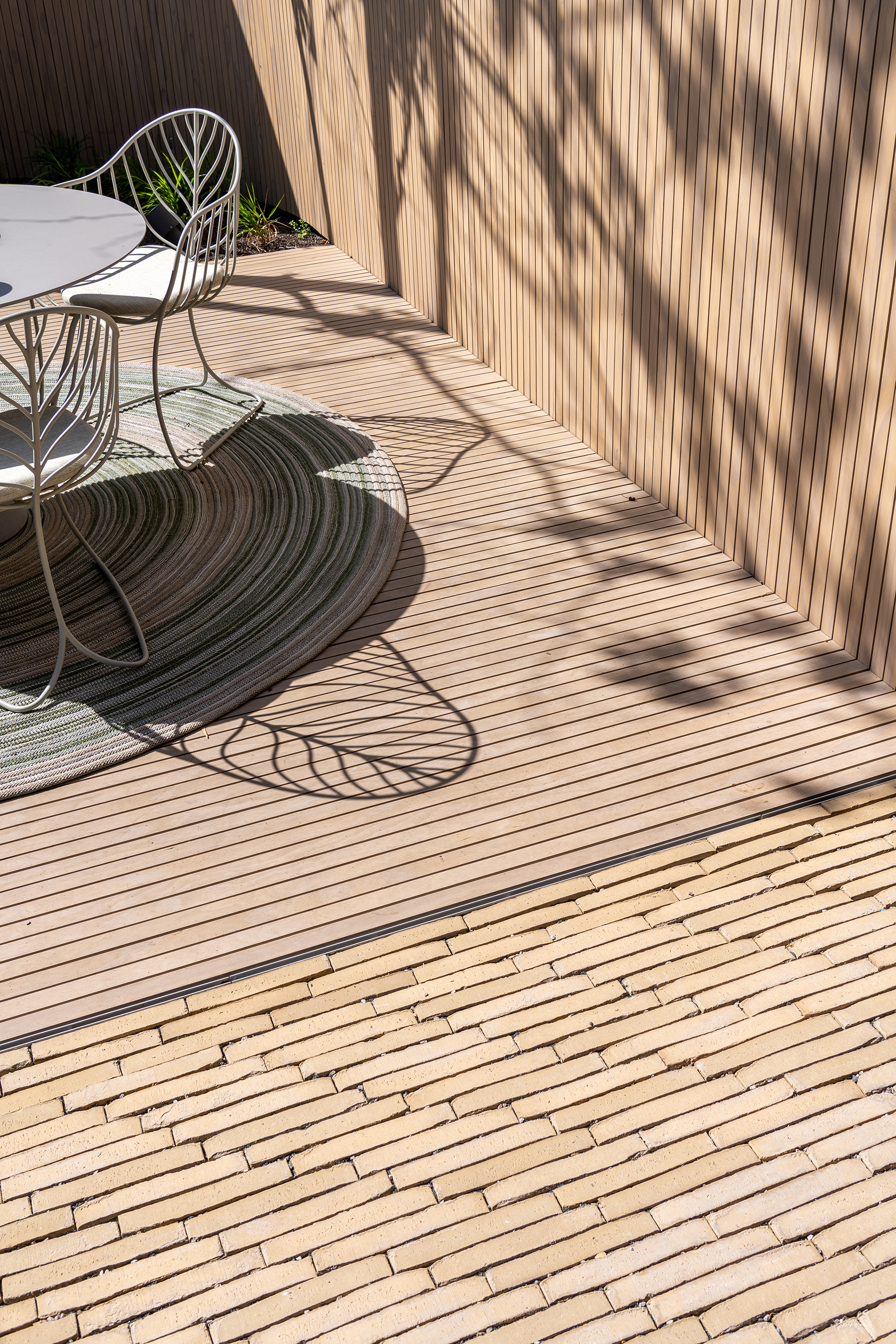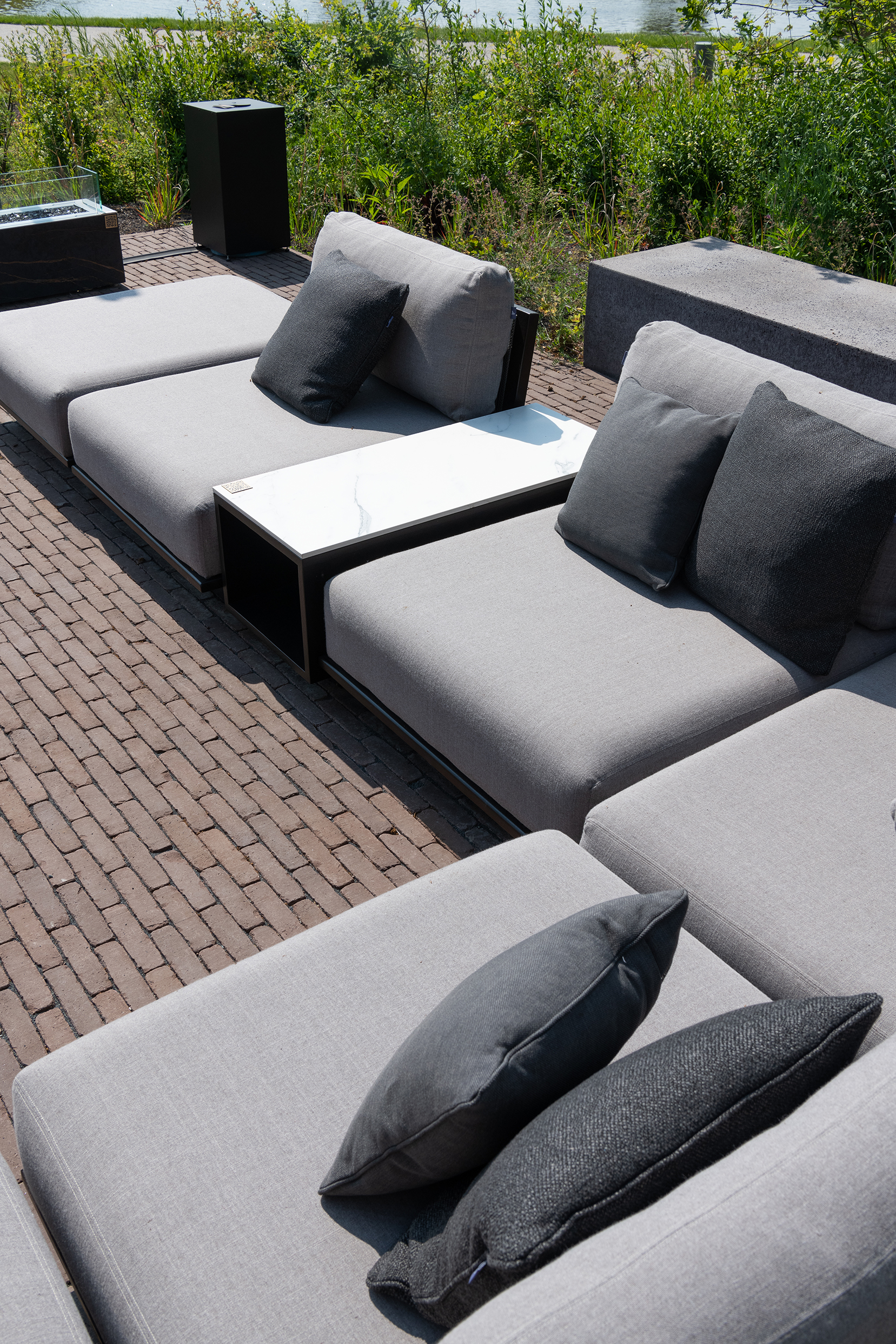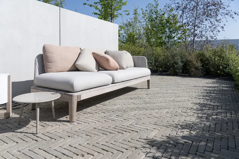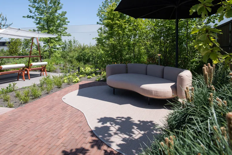 Zum Beispiel finden Sie neben der Plaza „Pavilion“, „Lounge“ und „Eden“. In diesen Gärten tauchen Elegantia Titan und Ancienne Belgique Perlegrau als Tonpflasterklinker wieder auf. Der Demonstrationsgarten „City“ zeigt, wie sich ein kompakter Stadtgarten kreativ einrichten lässt. Zum Beispiel entsteht dort ein sehr schöner klarer Schwarz-Weiß-Kontrast zwischen dem SeptimA Graphit und den weiß verputzten Mauern, die den Garten umgeben. Der Elegantia Vanille wiederum harmoniert sehr schön mit dem tropischen Hartholz und erzeugt mit seinem schmalen Format und seinem hellgelben Farbton den angenehmen Eindruck einer „Freifläche“. Der SeptimA Salbei wurde in einem anderen Bereich von „City“ auf spielerische Weise kreisförmig verlegt und bildet damit einen idealen Sockel für die dazu passende Bank von Extremis.