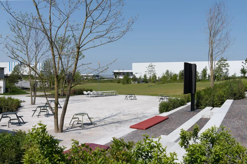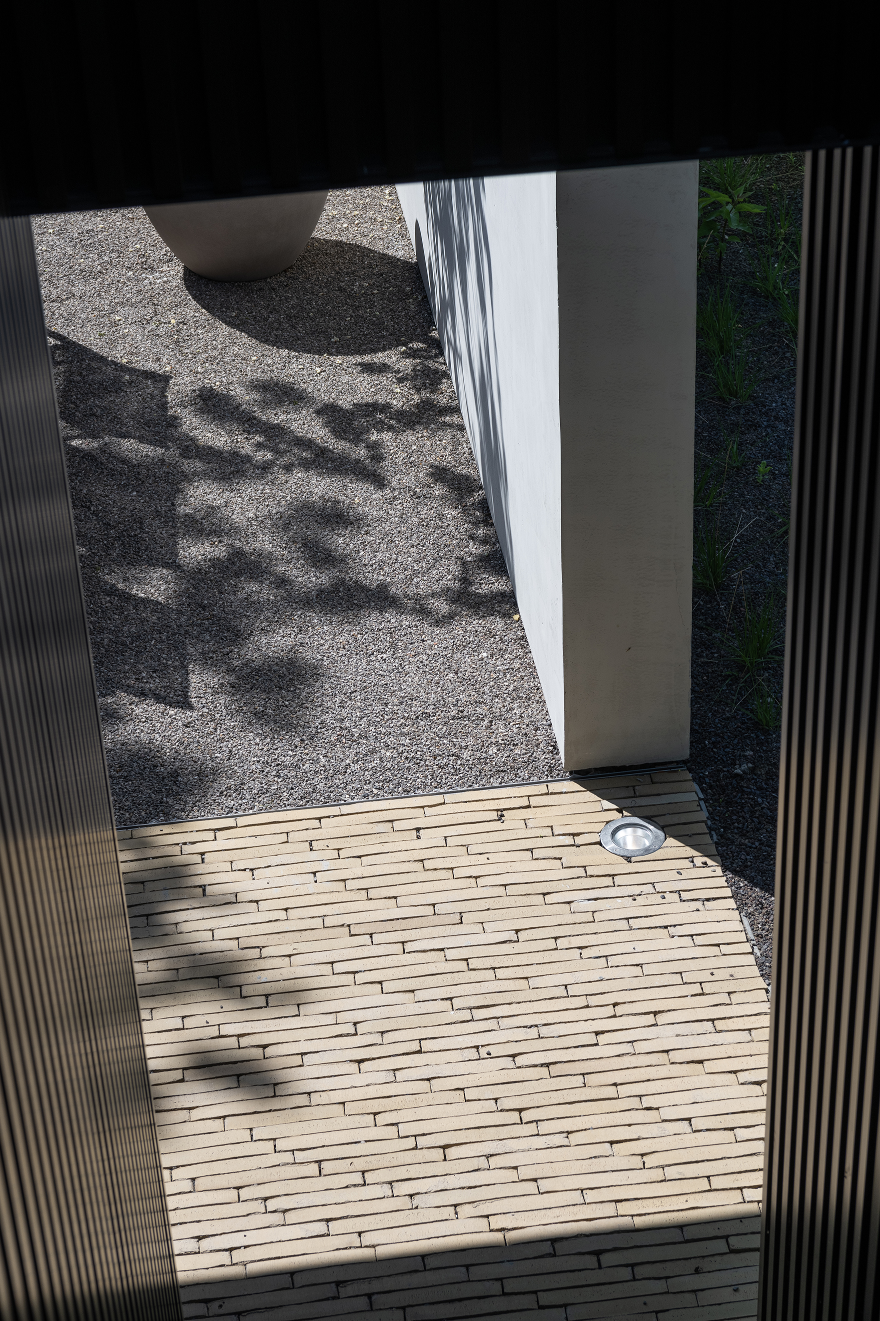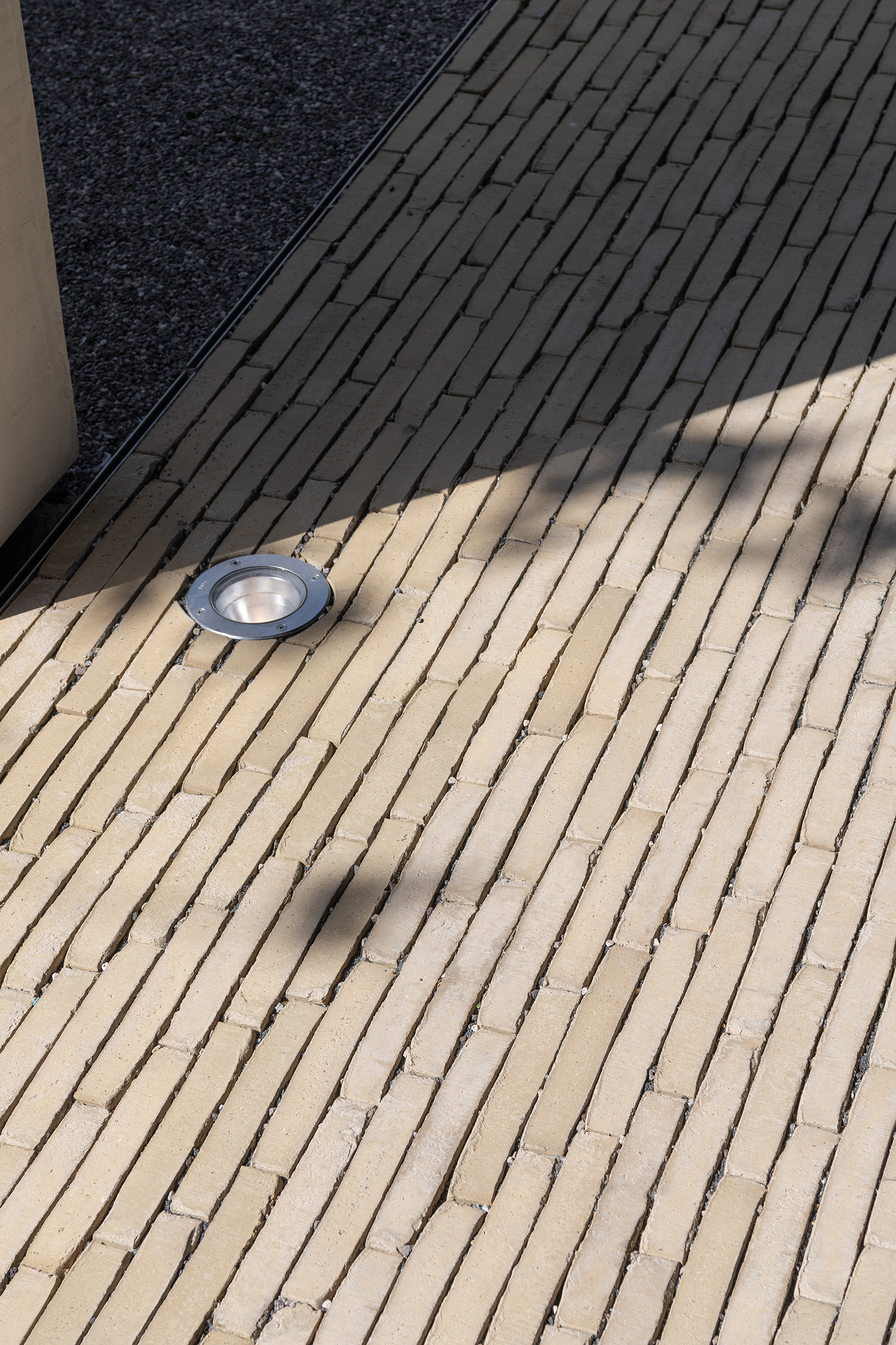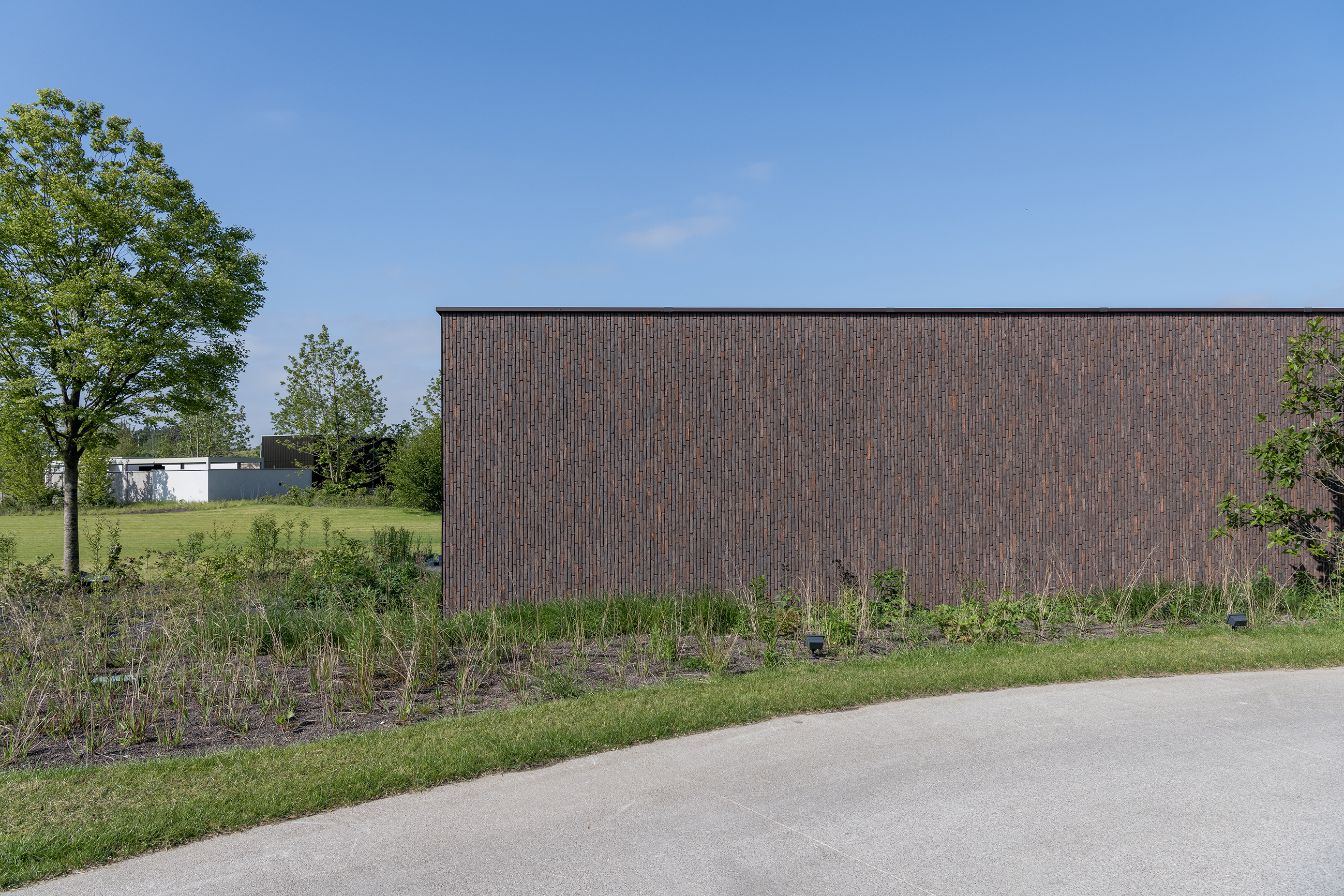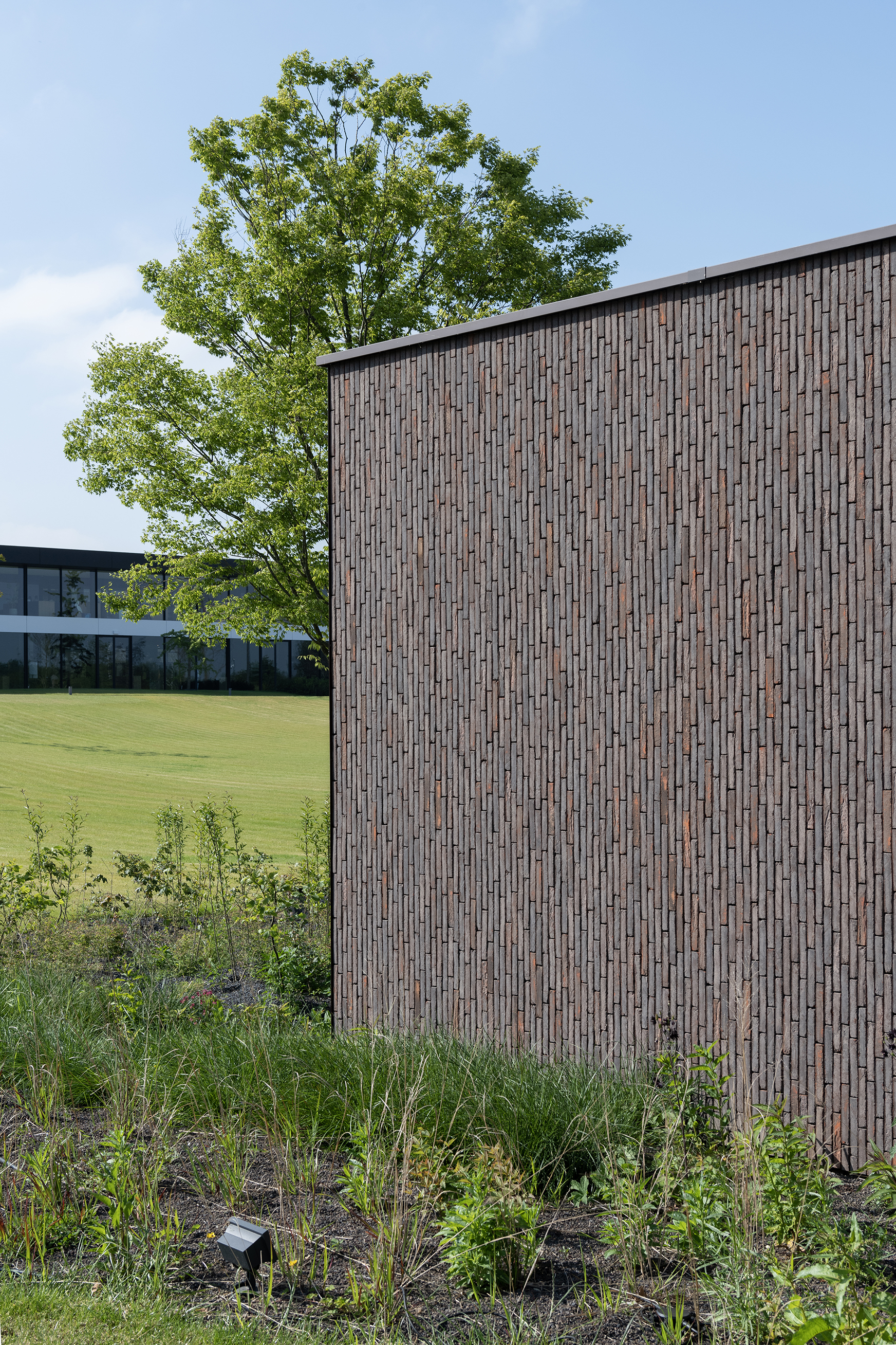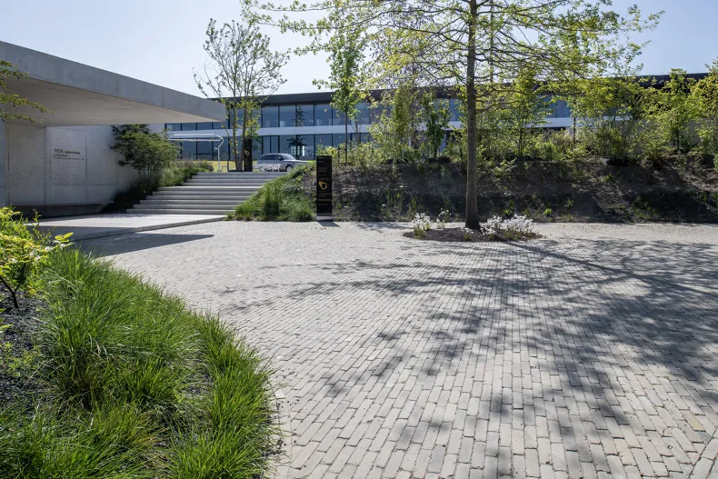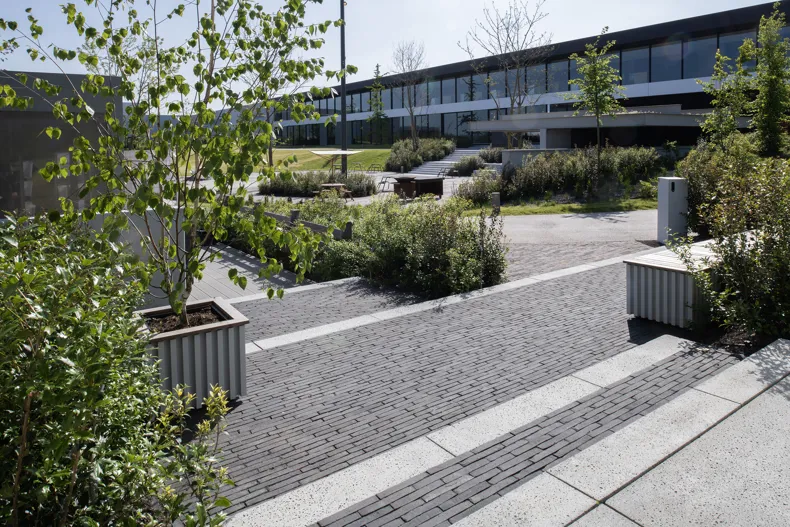 Ein weiterer Klinker spielt eine entscheidende Rolle im wasserdurchlässigen Belag des Außenparkplatzes. Denn dort wurde der SeptimA Olive nach dem Prinzip des H2O Natural Clay Paving eingesetzt. Diesen Parkplatz erreichen Besucher, wenn sie aus dem Gewerbegebiet kommend auf das Gelände fahren. Dort wähnt man sich sofort in einer anderen Welt. Man befindet sich am tiefsten Punkt des Geländes und nimmt die Abgeschiedenheit des Ortes besonders stark wahr. Nach dem Parken – das bei schlechtem Wetter auch unter dem Gebäude möglich ist – gehen Sie durch den Empfangspavillon zum Haupteingang. Sie passieren den zentralen Platz, vorgesehen für Networking Events und Vorträge für Profis aus der Garten- und Landschaftsarchitektur. Diese „Plaza“ verkörpert den Innenhof eines Boutique-Hotels.