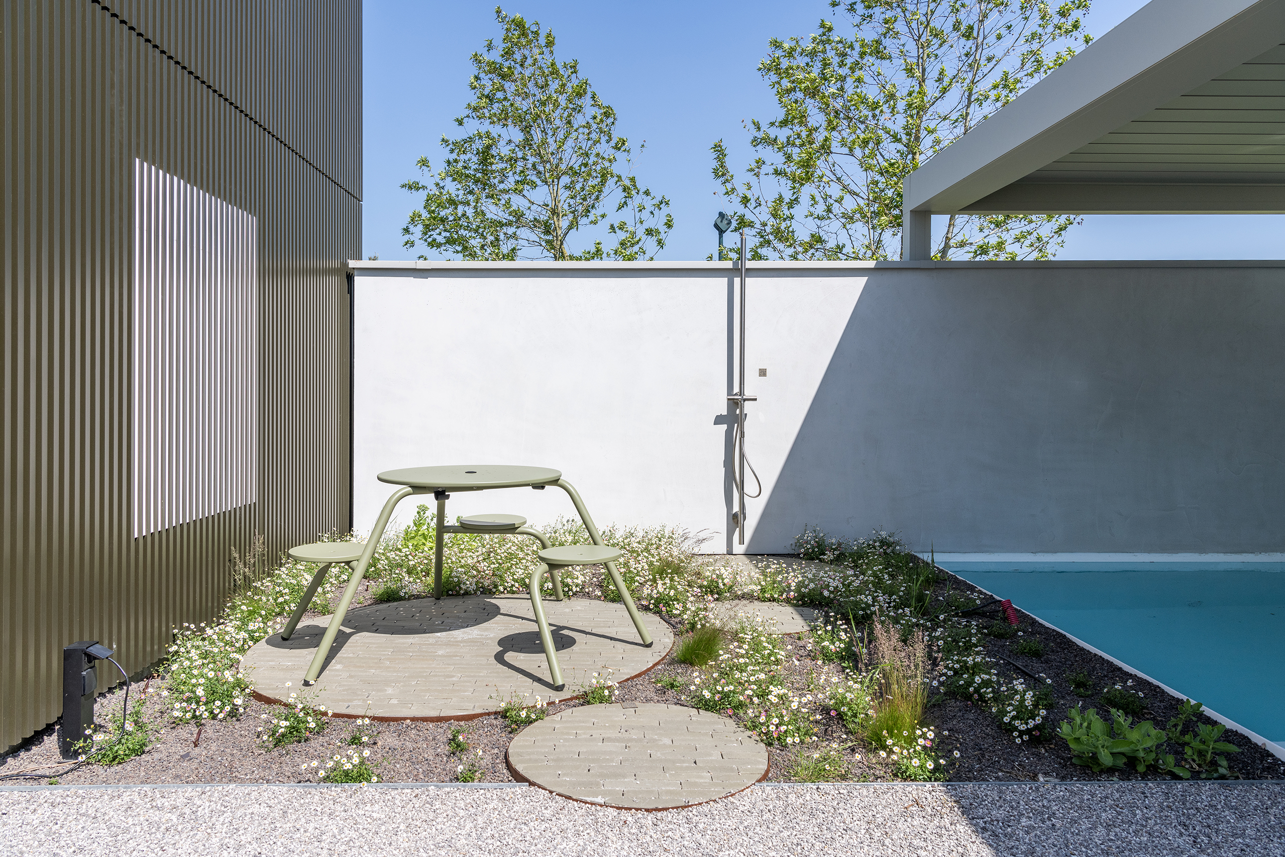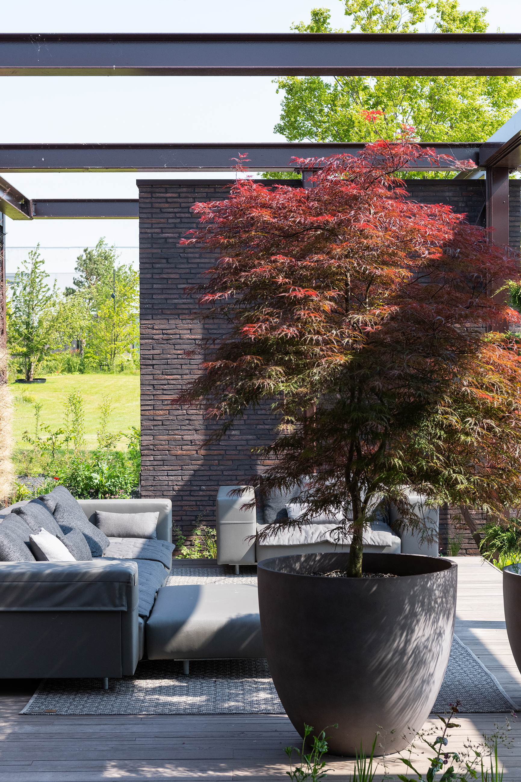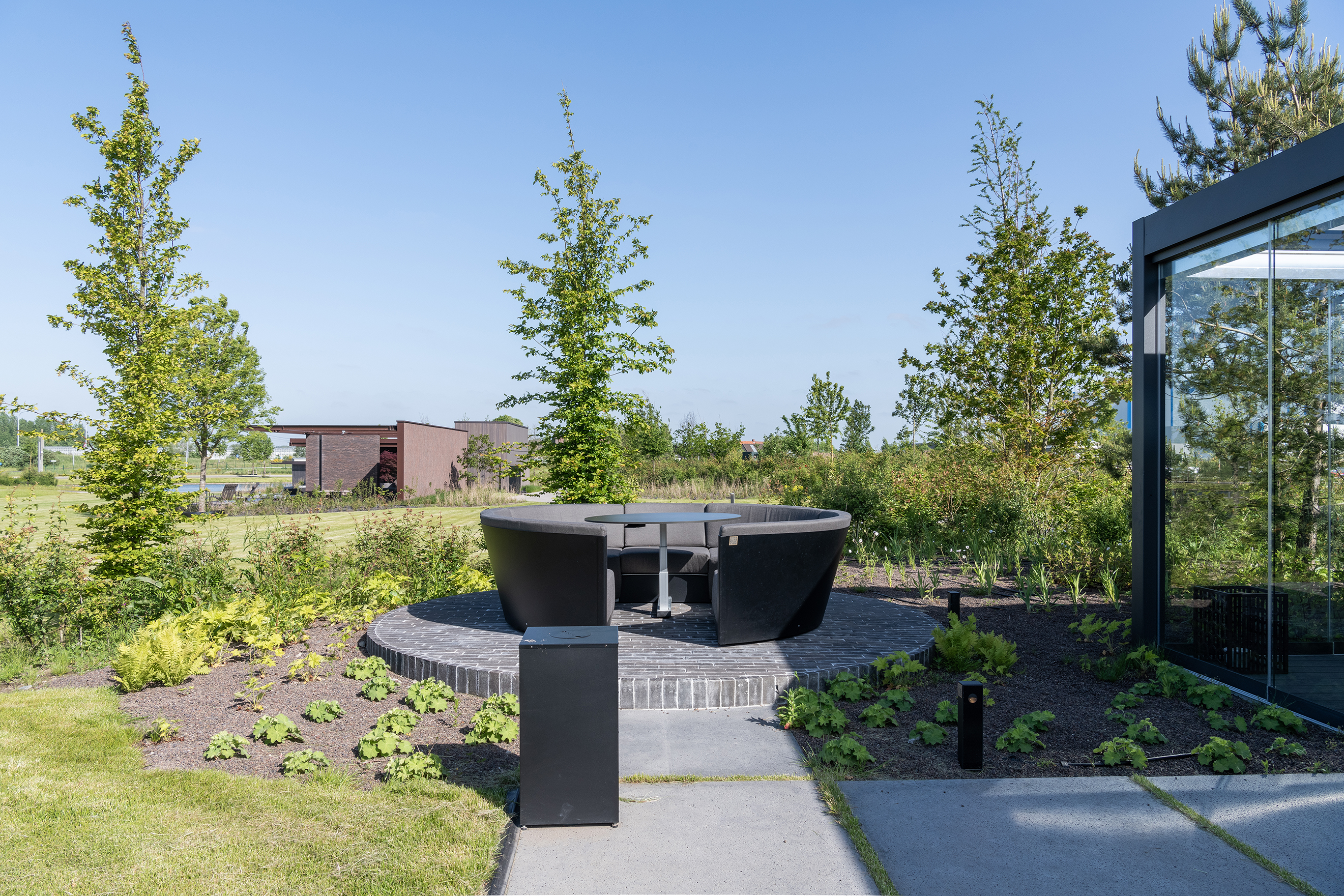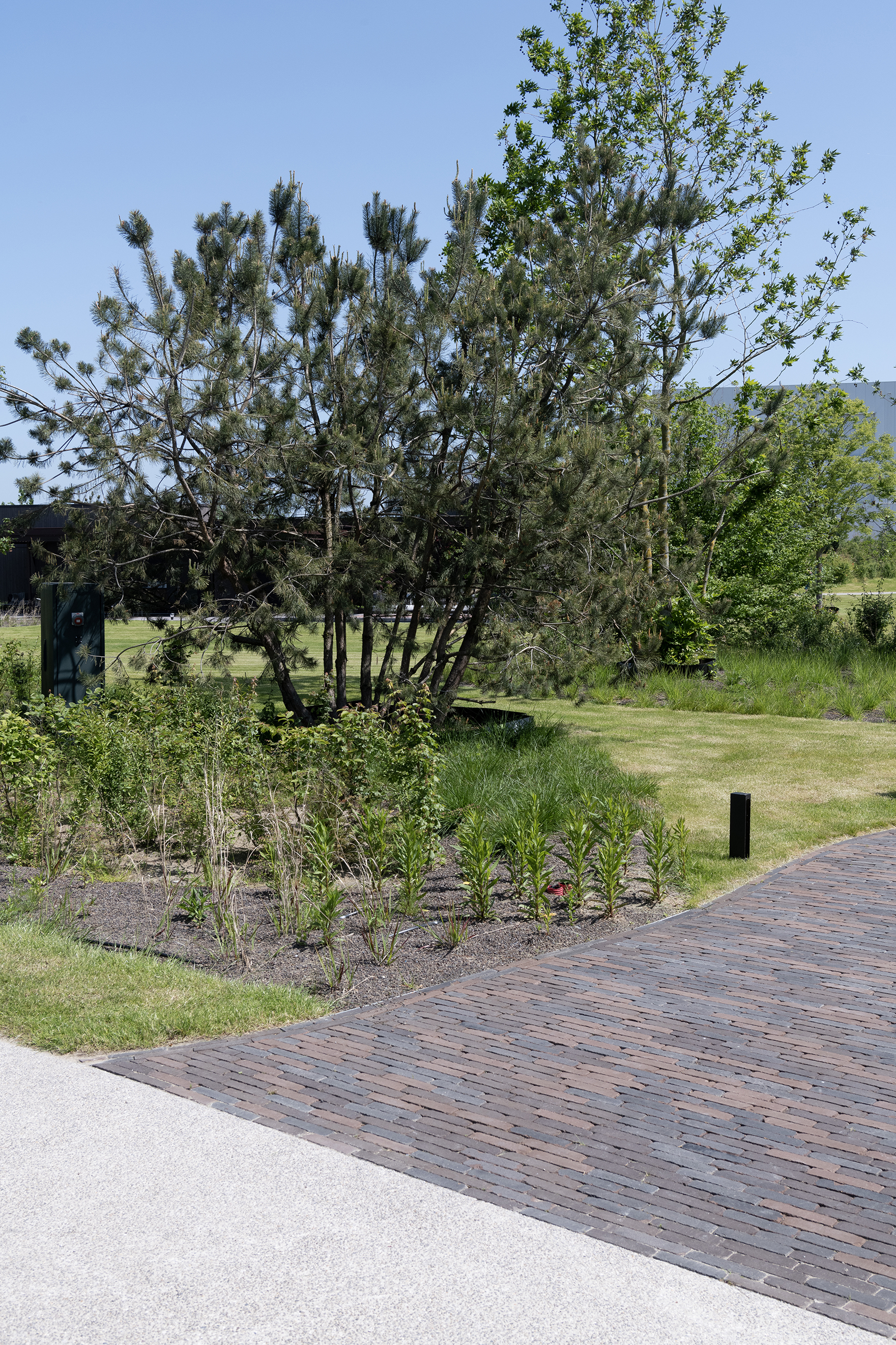 Dadurch bleibt das Erlebte viel länger im Gedächtnis, weil der Park nicht als Showroom wahrgenommen wird. Sie befinden sich dort quasi in einem Kokon, abgeschieden von dem angrenzenden Gewerbegebiet in Kruisem (Provinz Ostflandern). Als der Auftraggeber Koens schnelle Skizze sah, war er davon sofort überzeugt und beauftragte ihn mit der Gestaltung der Außenanlagen. Die verschiedenen Settings der Gärten wiederum basieren auf einem Konzept von Maister. Der Park ist heute bereits eröffnet, aber natürlich wird es eine gewisse Zeit dauern, bevor er die Gestalt erhält, die dem Team vorschwebte. Ein Erscheinungsbild, in dem die ausgewachsenen Pflanzen noch stärker als Puffer gegenüber der störenden Umgebung wirken.