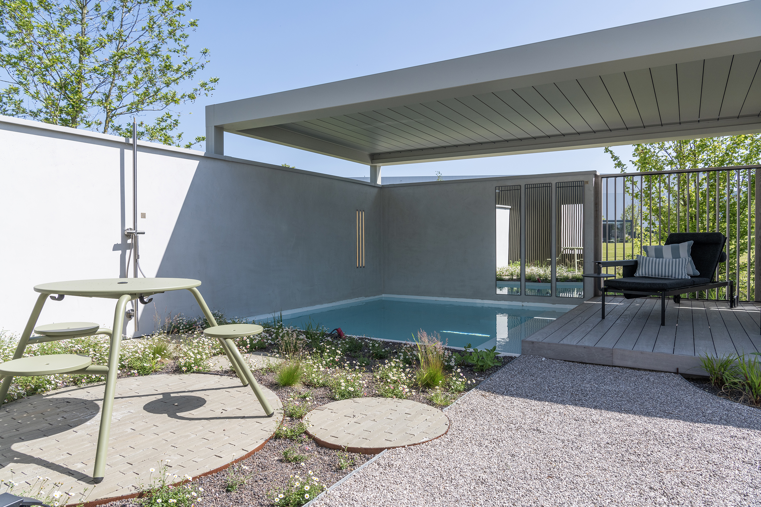Nirgendwo erleben Sie Outdoor Living so wie hier. Allein schon, dass all diese Gärten in einen weitläufigen Landschaftspark integriert sind, ist einzigartig. Garten- und Landschaftsarchitekt Koen Rygole: „So wird anstelle eines Outdoor-Showrooms ein großes Erlebnis geboten. Ursprünglich war geplant, die Gärten auf einer kleinen Fläche zu konzentrieren und den übrigen Park dem Personal vorzubehalten. Ich schlug vor, das gesamte Gelände zu nutzen und einen Rundweg mit einer Länge von circa einem halben Kilometer entlang der Gärten anzulegen, der die Besucher in unterschiedliche Ambiente führt.“