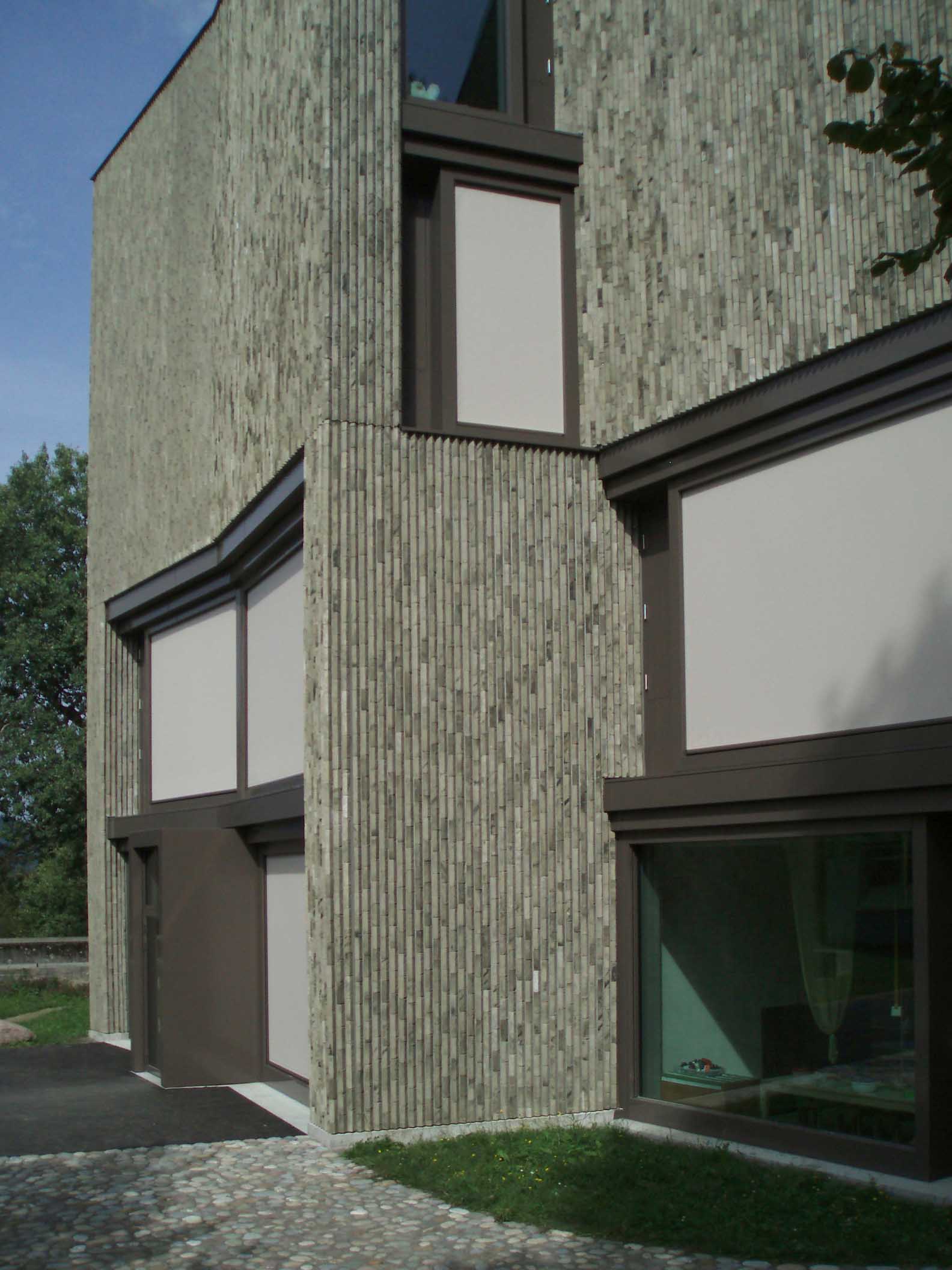 Da die Verblender nicht flach verarbeitet wurden, entstand ein Relief mit vertikalen Schattenfugen. In Kombination mit der natürlichen Nuance des Hand-Made Verblenders ergibt diese Verarbeitung ein sehr lebendiges Fassadenbild.