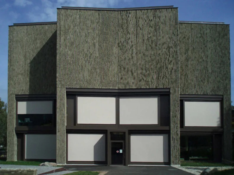 Dadurch, dass die Zimmer deutlich in eine Richtung orientiert sind und mit sekundärem Licht aus einem angrenzenden Klassenzimmer beleuchtet werden, entsteht an den Fassaden eine Abwechslung zwischen großen Fenstern und Verblenderflächen. So erhält das Ganze eine bestimmte Rhythmik und den Charakter eines Pavillons.